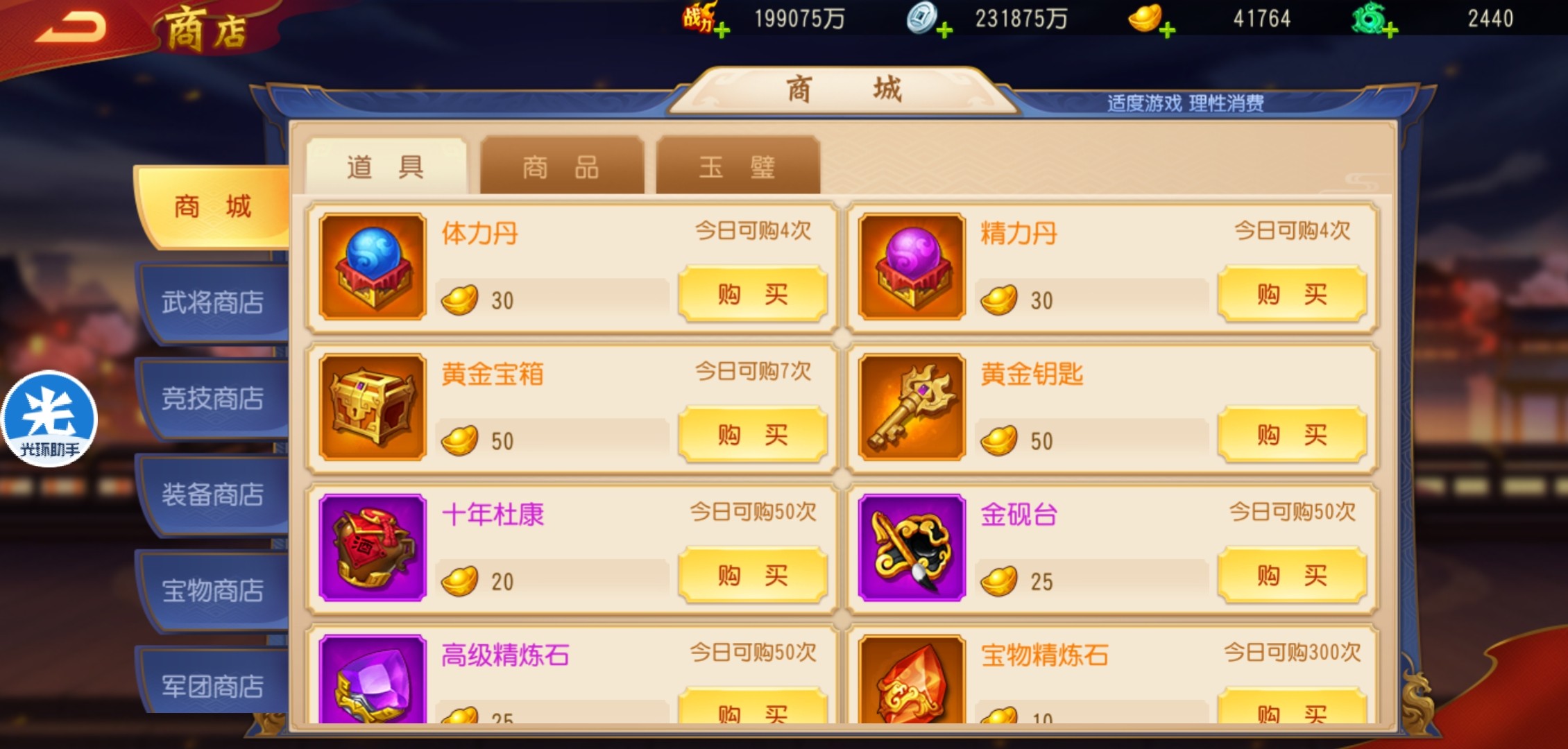 突破丹、杜康酒、刷新令、进阶石、精炼石这些资源都是溢出的,所以新手期时也可以减少元宝购买这些资源。