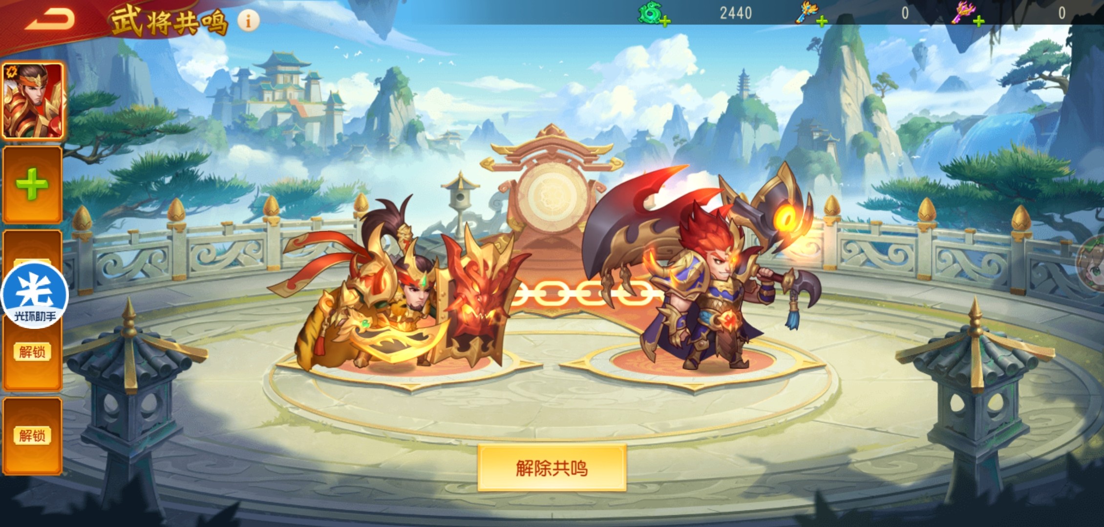比如双小乔,甘宁,夏侯惇开局的阵容,后期就可以放心的通过共鸣玩法将夏侯惇共鸣为孙坚使用。