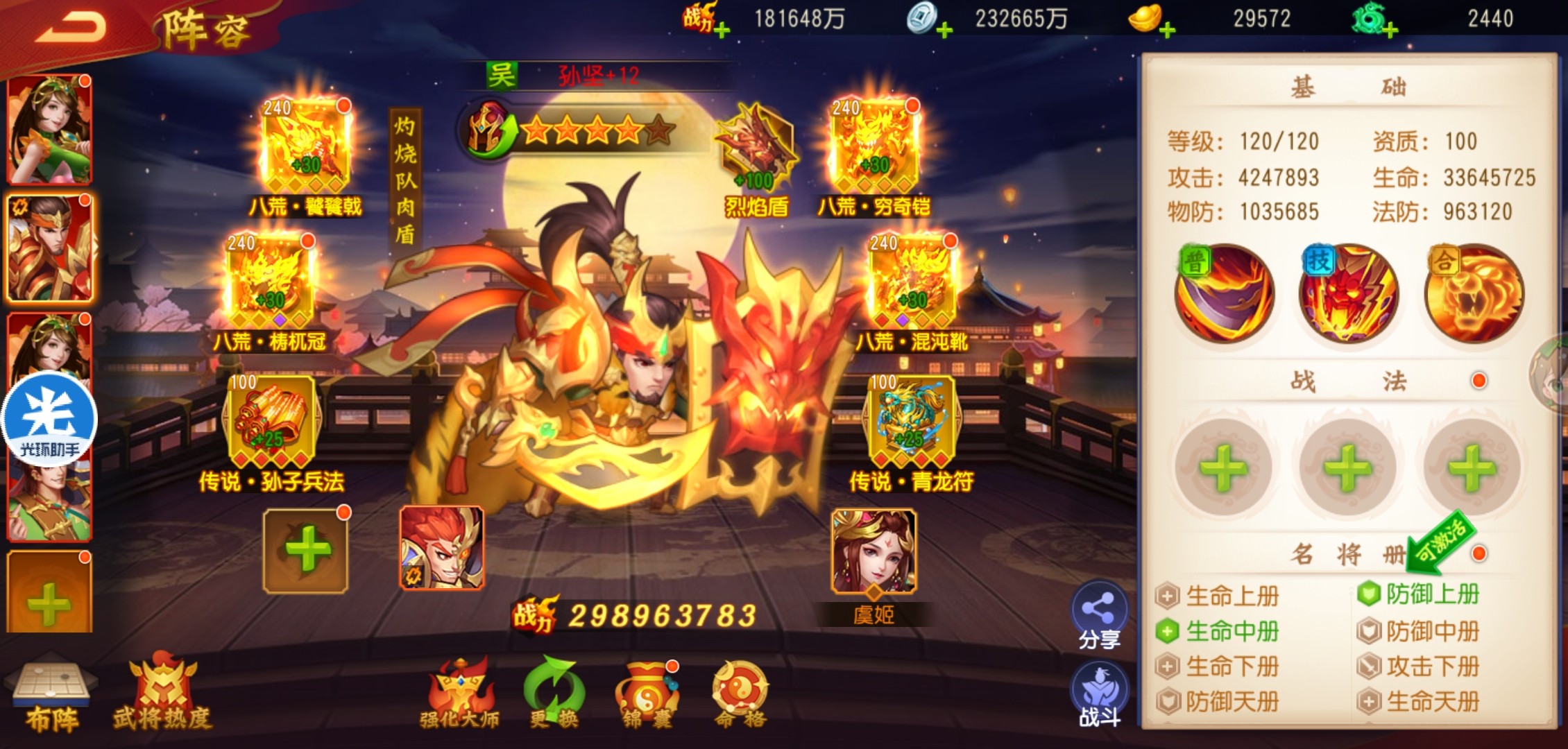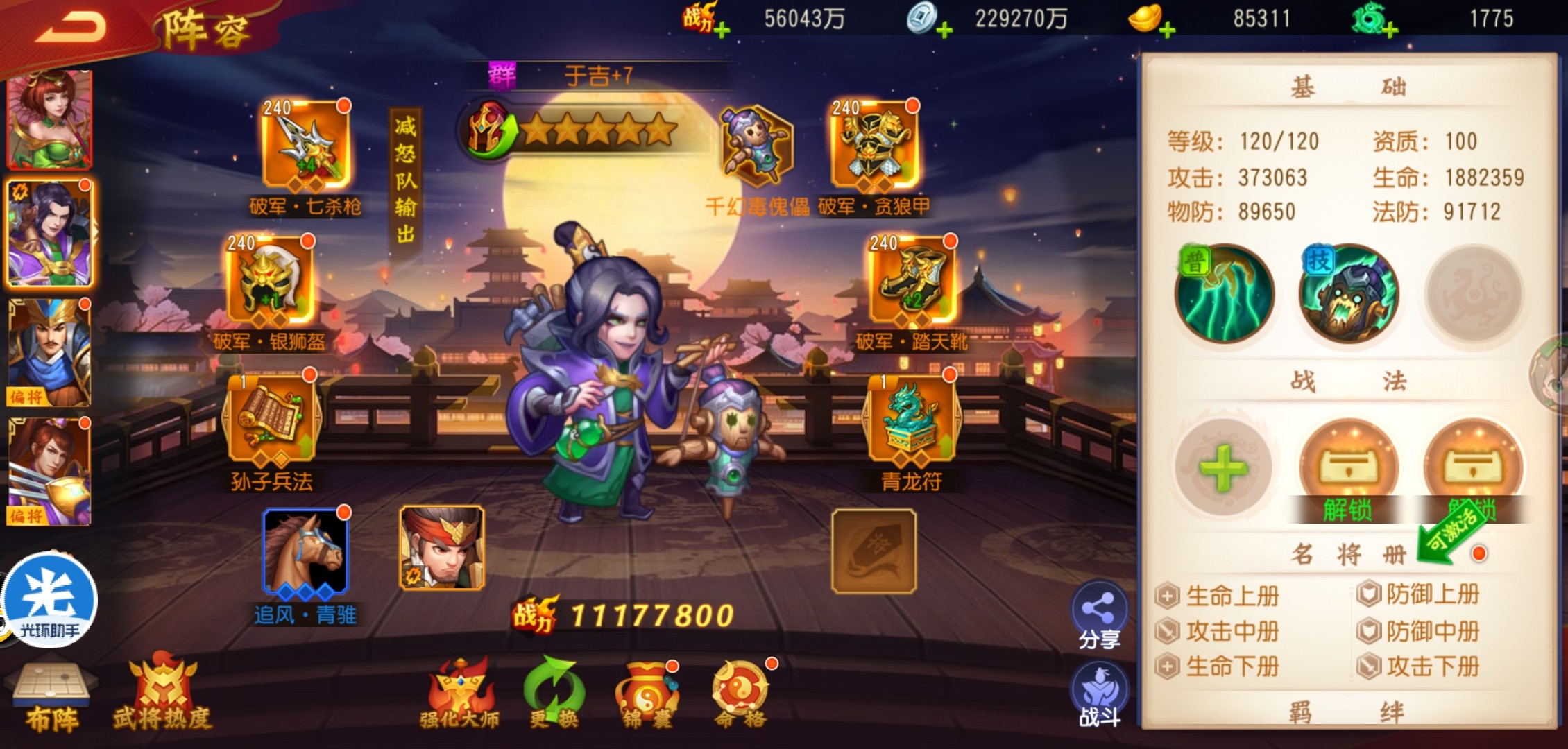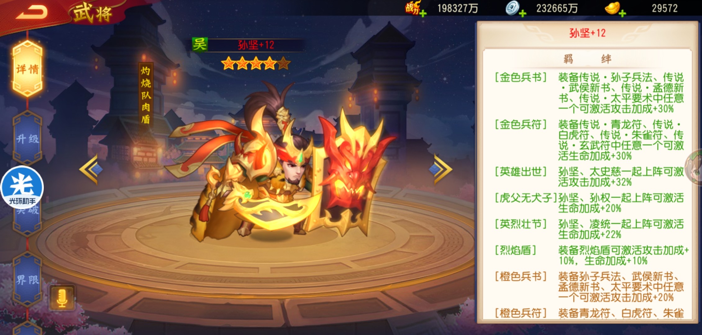 如果这时候进一步提升孙坚的等级,突破,觉醒,同样作为共鸣武将的于吉相应属性也能够得到提升。