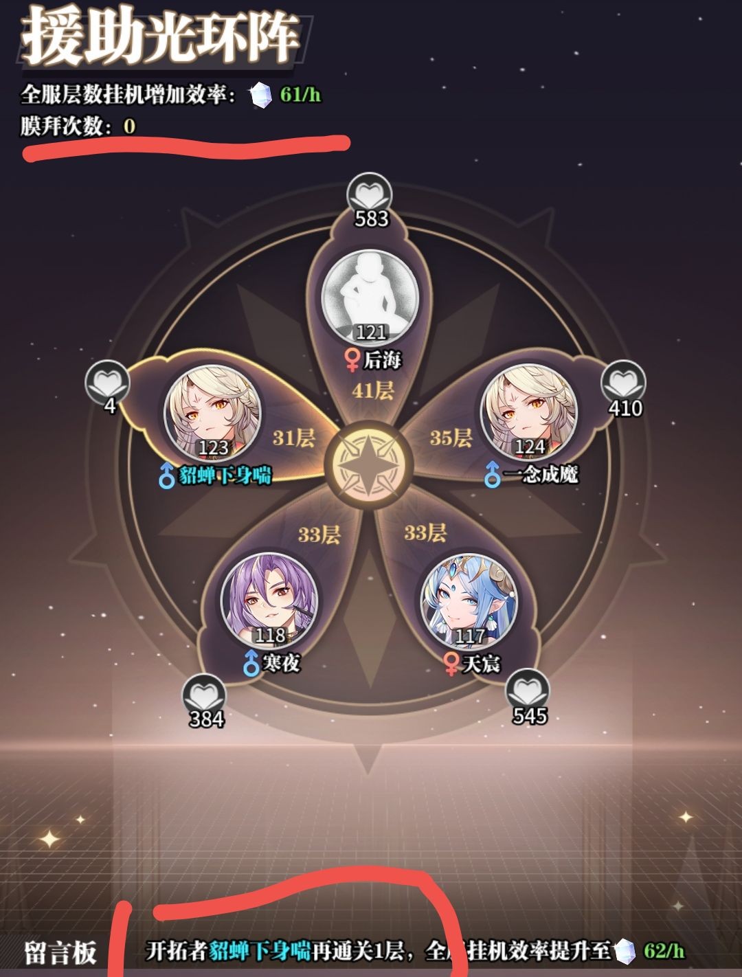 除了挑战的一次性奖励之外,我们还可以在当前层数挂机,挑战的层数越多,挂机奖励越高。
