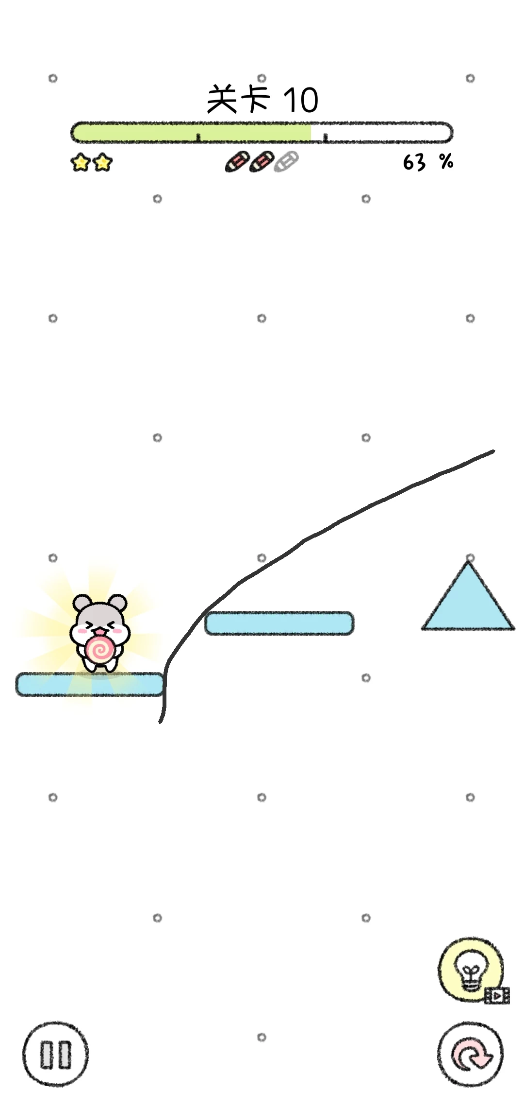 当然轨迹线可能是对糖果的轨迹的诱导,也可能是给糖果提供一个动力,在游戏之中这个画笔的作用可以说是千变万化的。所谓一百个人一百个哈姆雷特,同样一个关卡也会拥有不一样的方式通关,这一点来说游戏并没有什么限制,也没有固定的通关方式,自己随行发挥就好。在游戏之中你可以自由的畅想,只要能够让糖果一笔走到仓鼠身旁,怎么玩你都随意!