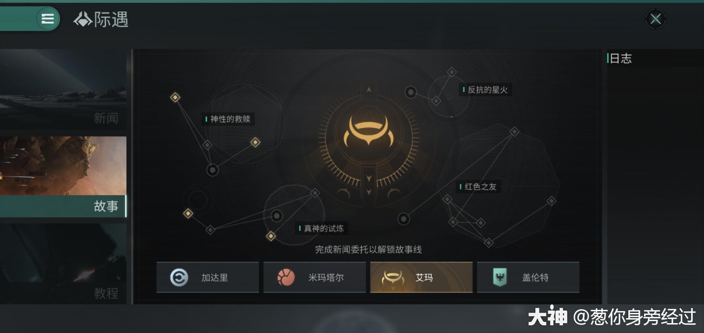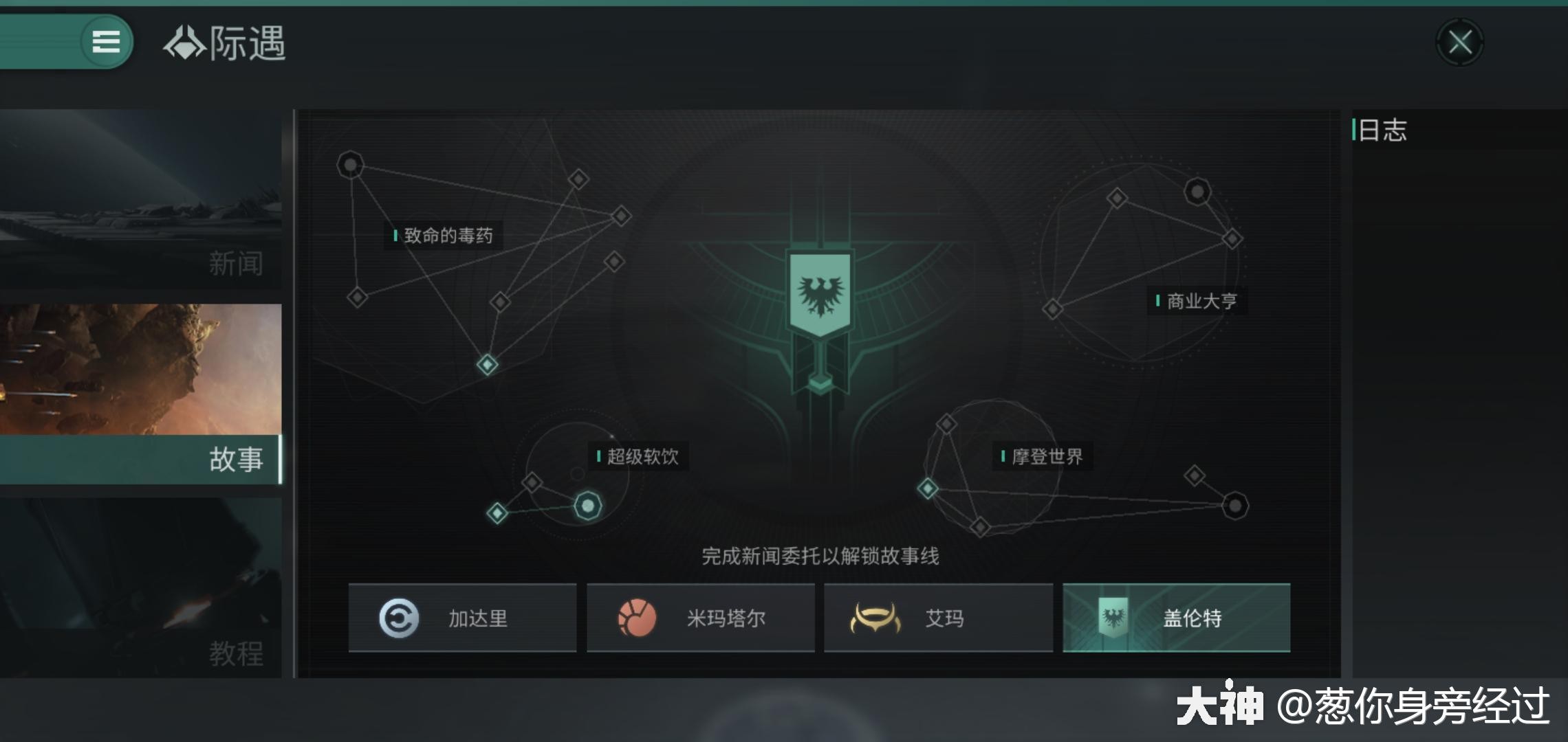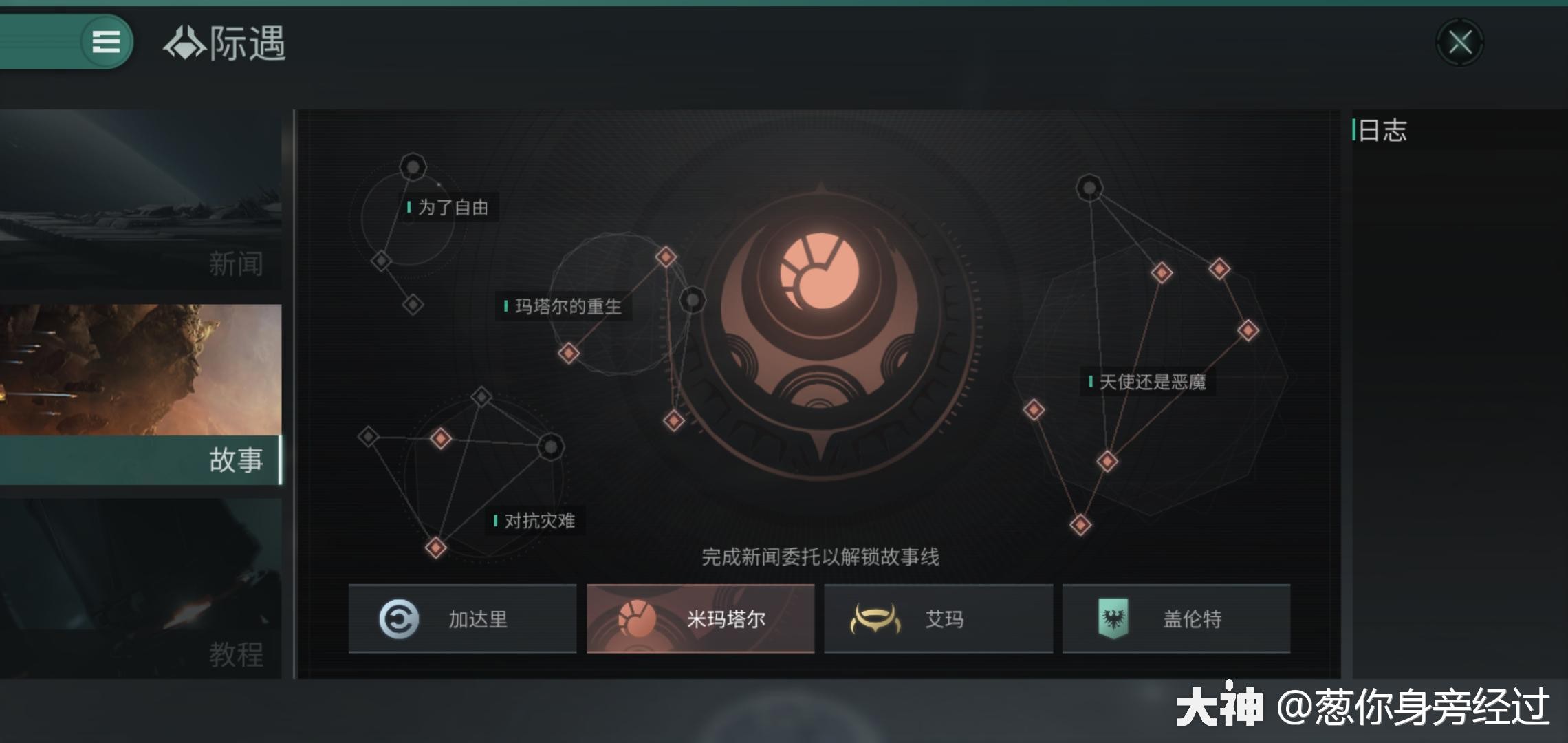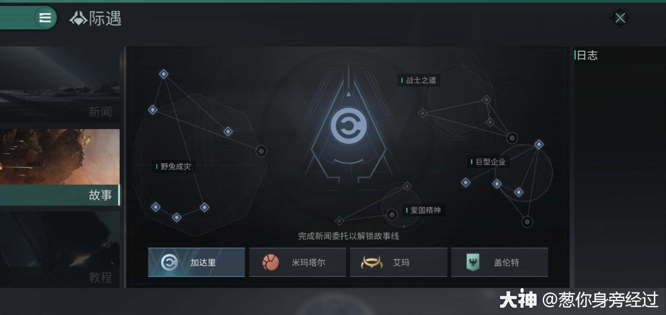 分为四族以及白势力发布任务(不在故事线中的任务,比如某某人的海狞獾),完成这些势力任务的好处是可以得到故事书,上图是各族的故事线大体,如你所见,每个点都是一个任务,其中方型任务是比较好刷出来的任务