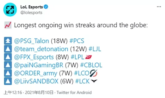 LoL Esports今日发推:全球仍在延续的最长连胜记录。