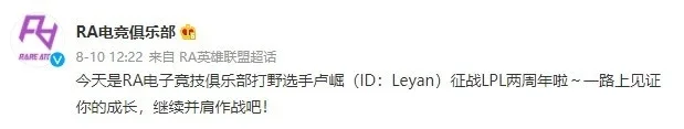 今天是RA俱乐部打野选手乐言出道两周年的日子,祝乐言选手之后的职业生涯一路长虹,在这个夏天取得满意的成绩~