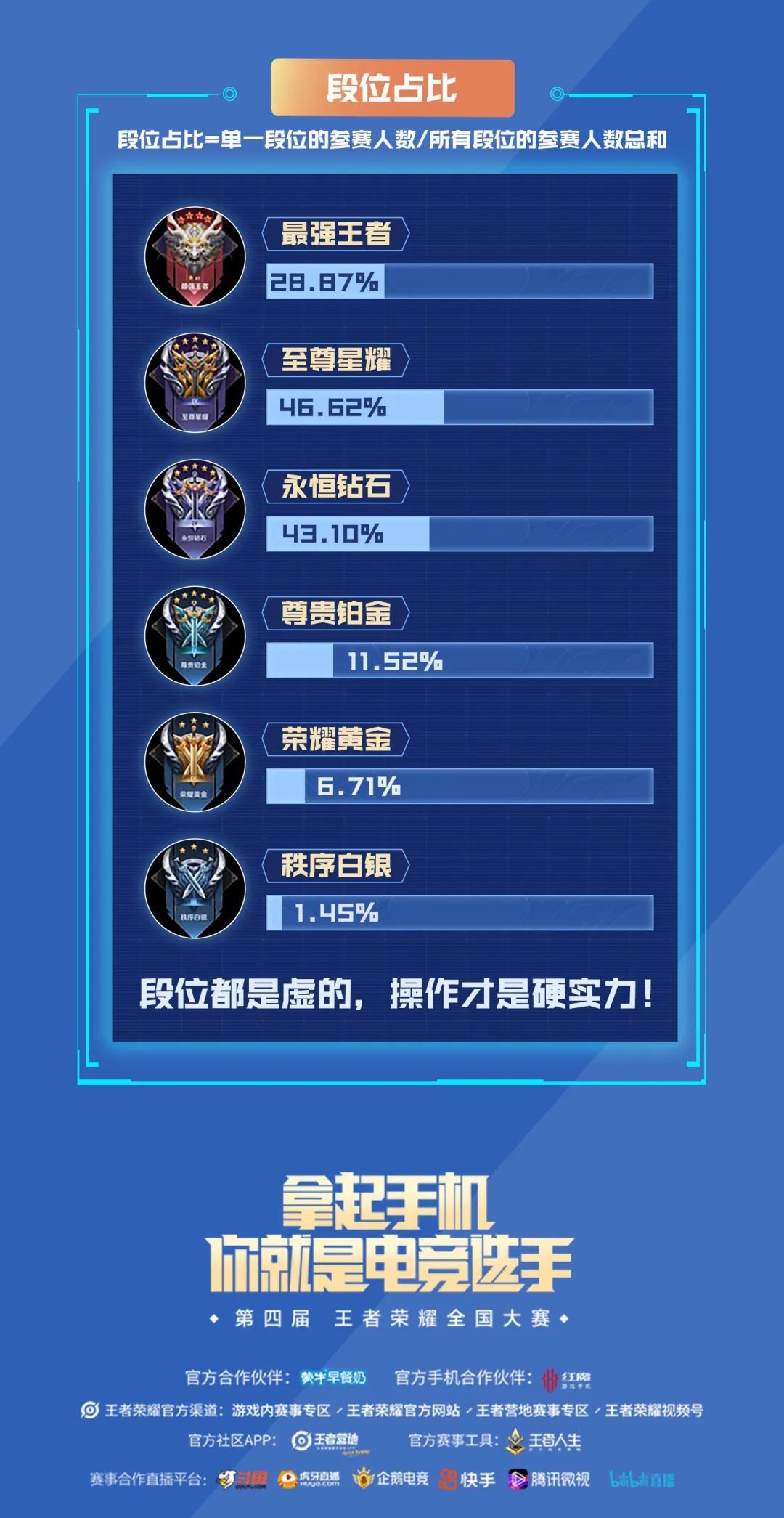 参赛选手段位占比最多的集中在星耀和钻石,本宝宝所在的最强王者段位则排在第三!