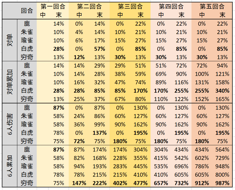同样对比白虎的170%主目标+60%额外目标(170% + 5 x 60% = 470%)穷奇的6 x 75% = 450% 也算比较看得过去
