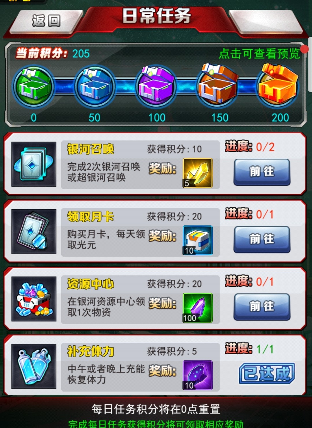 首先呢就是体力的消耗和绿晶的使用,你弟的消耗到了中期可以说是不好消耗的(给不懂的人听的),为什么这样说因为你的战力刷关刷到了一定程度了,已经不能再刷了,大家会拿来干嘛,拿来刷因帕克吗?但对于二次玩家来说,因帕克这种东西到了中期,要看所需的物资,缺什么才能去刷,不然物资堆积严重,几乎毫无用处,我们应该先怎么样?分四个时间段登录(到晚都玩的,我就不说了),有效的利用时差,来进行任务。首先,日常任务是必先放在首位必须要做的,因为到了中期,这除了成就之外的一大光元收入。