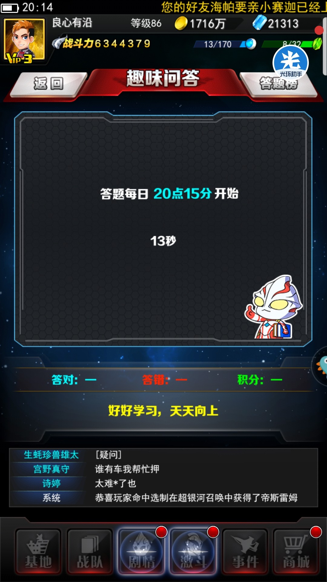 还有就是答题了,正所谓“好好学习,天天向上”每次活动的奖励也是十分的丰富,有时候会送光元,有时候会送月卡券,但我比较倾向于光元,别问我为啥。