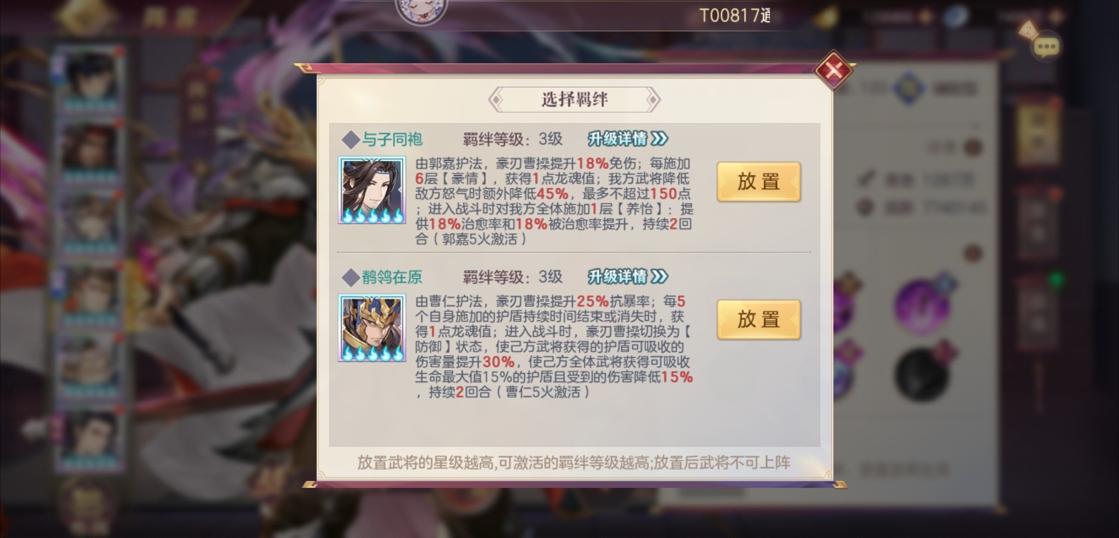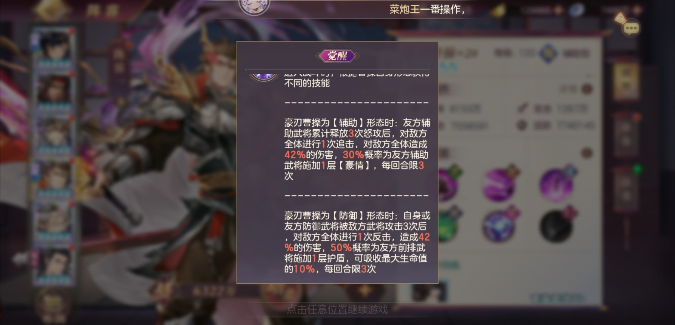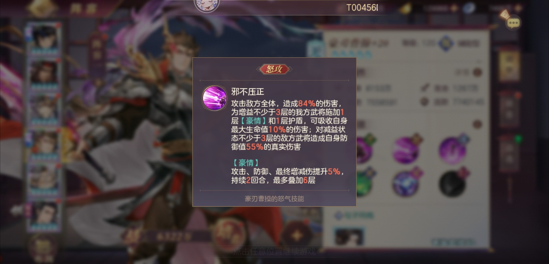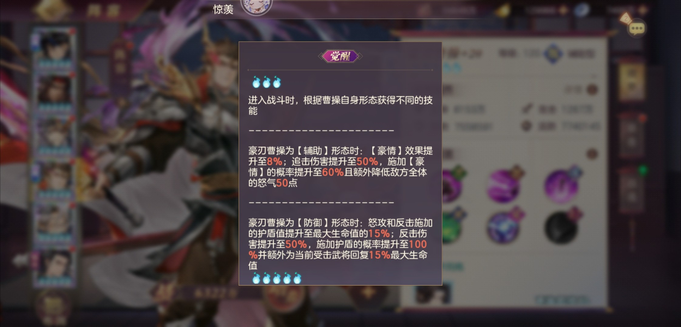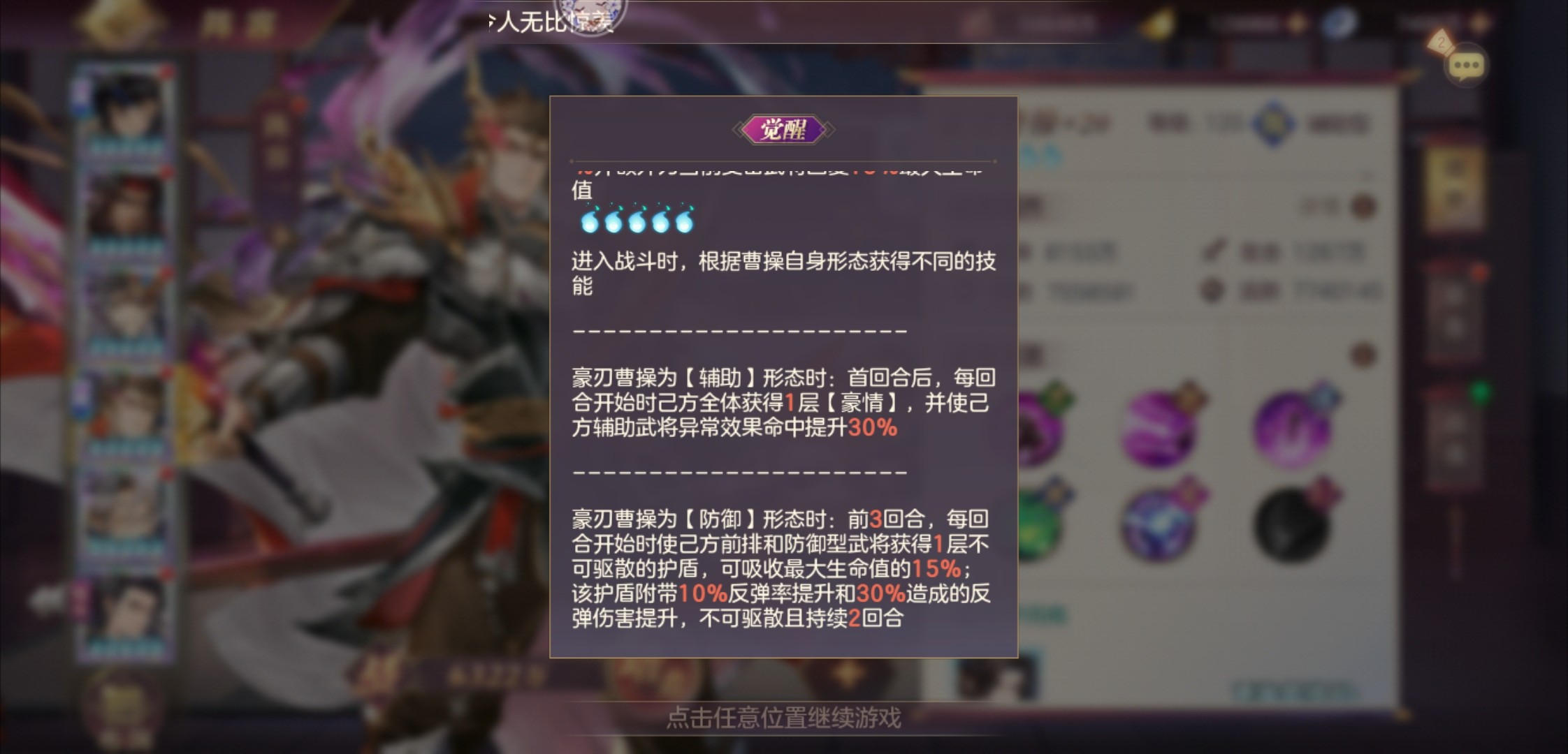 辅助形态的曹操覆盖面对于版本来说比较广泛(环境里辅助将很多 例如曹丕华佗诸葛果)受益单位不用太担心 这个形态可以直接契合脏水队体系 无论是怒攻频率亦或者词条收益上都是近乎完美 豪刃曹操主打的一个“豪情”机制可以通过体系的频繁怒攻来叠加 配合龙魂技 理想状态下2-3回合就能叠满