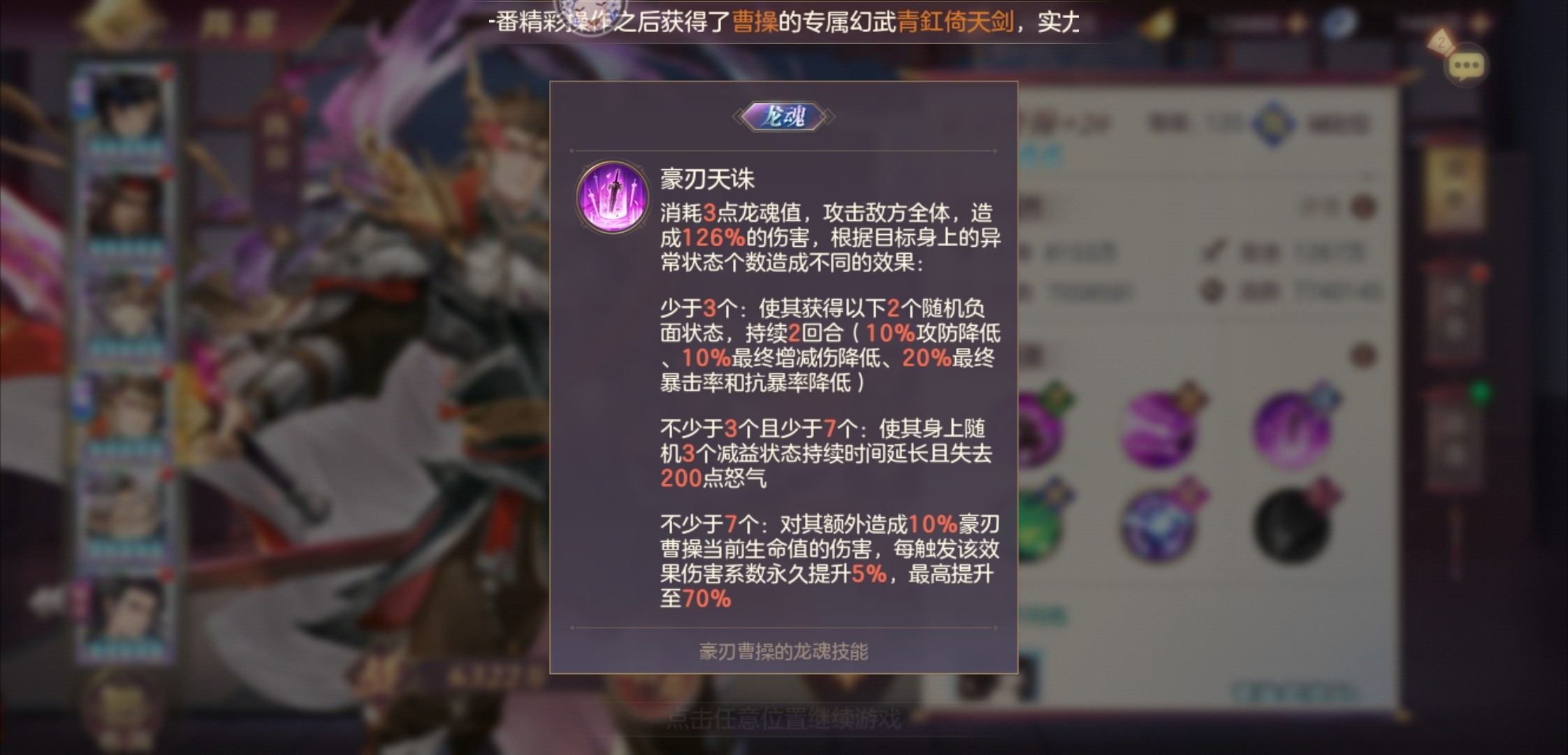 如果是二挡(3≤debuff<7)起步豪刃曹操第二个龙魂技开始就准备起飞了