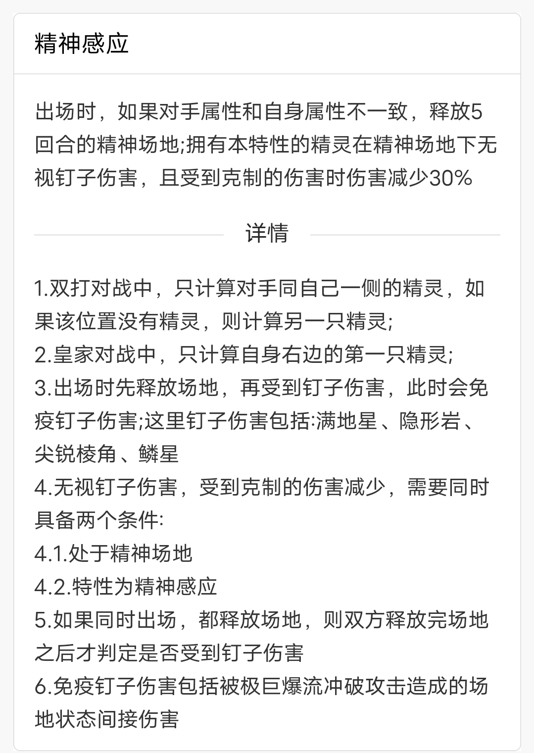 还有一个效果,就是不会受到钉子的伤害,那么这个相对来说,相对来说比较给力,假设这个精灵可以学习清除浓雾,那么记得整个游戏当中比较少见的无伤上场,然后解除钉子,上一个这么做的就是火焰鸟,但是坟头草已有两米高了😂