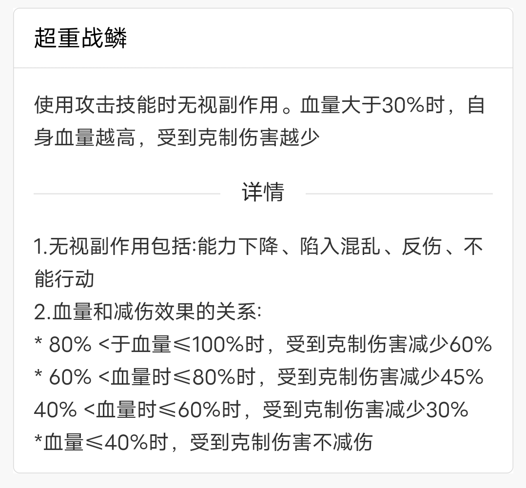 这个专属另外的效果就是回血和配合两个特性,一个是老特性,一个就是新特性,老特性不用多说了,纯属的肉盾玩法,新特性的话,如果配合这个专属有伤害,而且也有一定的防御能力,非常的不错。