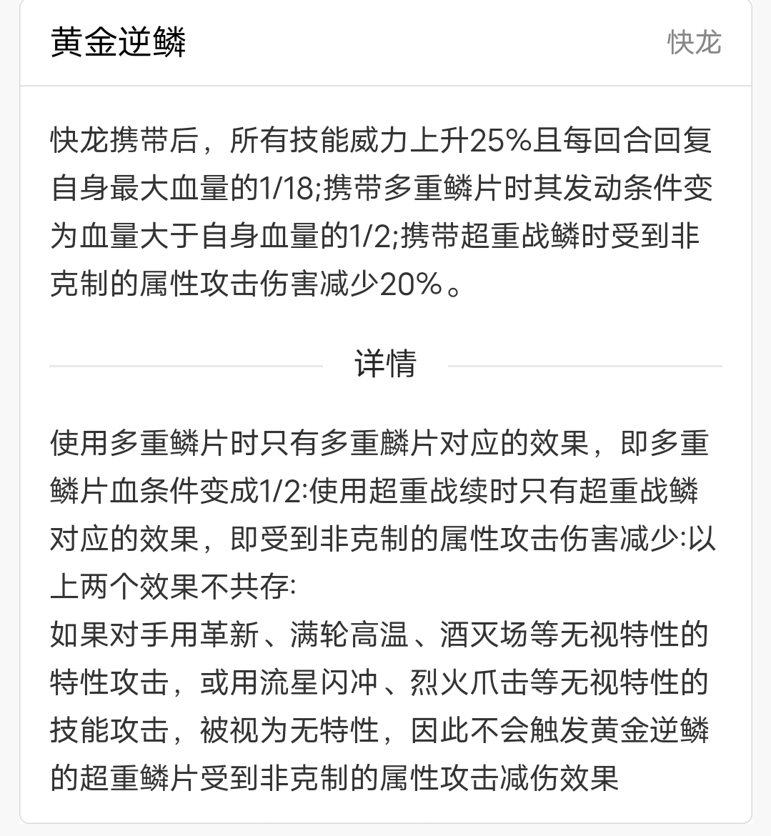 更关键的是这个这个特性还可以,无视技能的副作用,我这里有一个简单的输出玩法,给大家做一个参考,主要就是用两个技能就好了一个是龙之舞进行加速,另外一个就是龙鳞之怒不过有一个非常大的缺点,就是虽然说没有混乱的副作用了,但是遇到妖精属性的精灵还是十分尴尬的,所以说如果快龙想打输出玩法的话,最关键的一定要把对面的天敌优先解决要不然的话你一个龙鳞之怒甩过去,然后好家伙对面上一个妖精属性的精灵,你就当场蒙了。