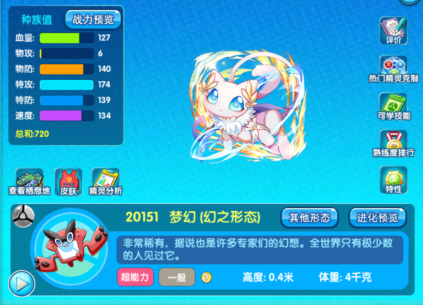 从目前的资料上,我们可以得出结论,就是这个精灵,它是可以输出,也是可以辅助的,大家可以看到他的这个种族值,分配可以说是比较合理的,无论是当做辅助还是当做输出,都有着一定的可玩性。而且也给了新的特性,我给大家看一下