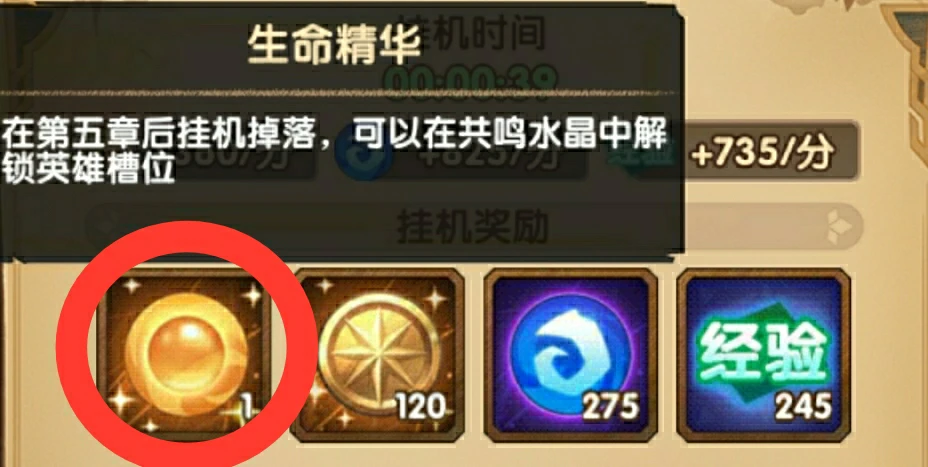 ①金币、②英雄经验、③玩家经验、④英雄粉尘、⑤生命精华