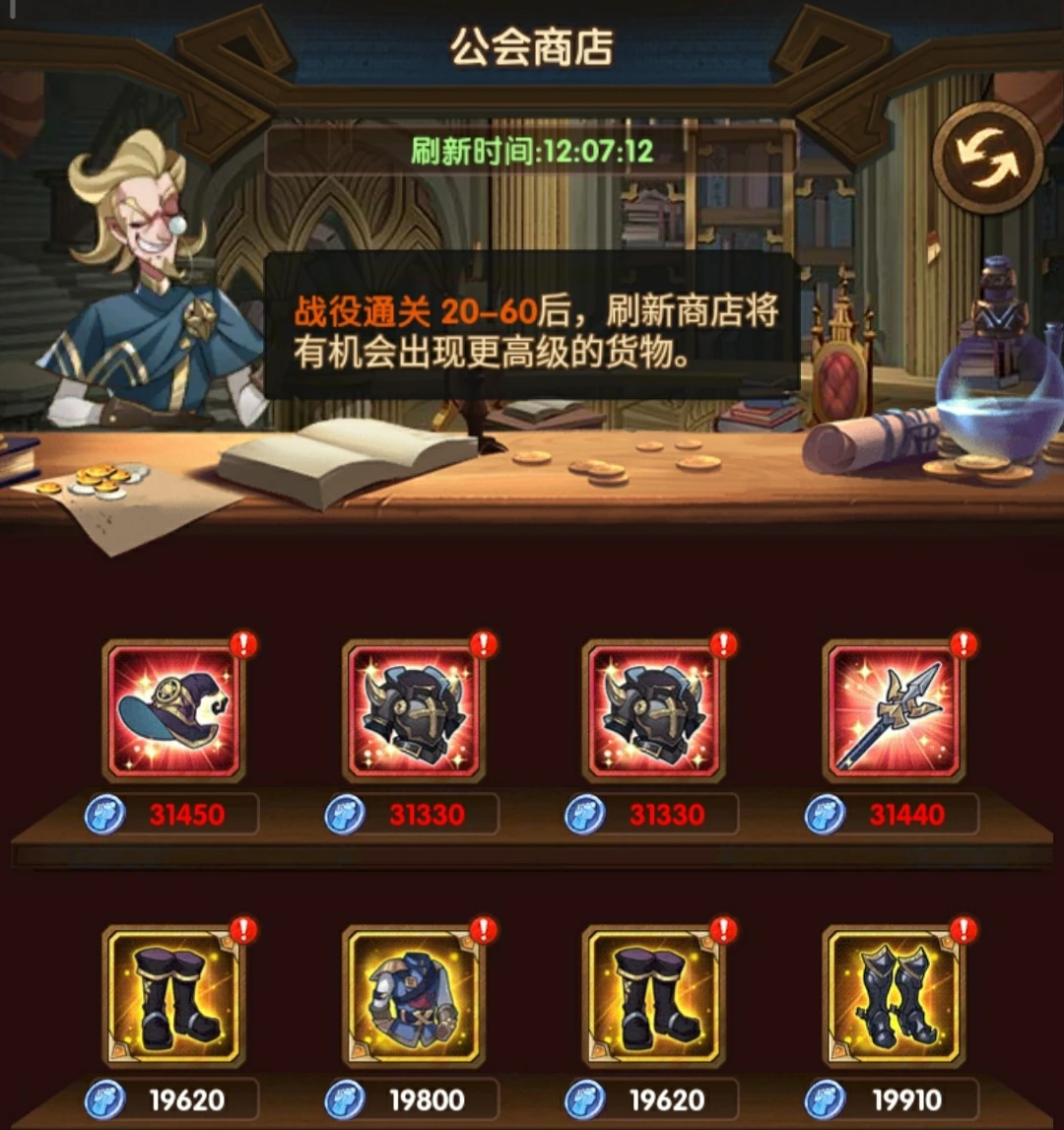 (Tip:强烈建议不要购买任何绿、蓝、紫甚至金装只买红装,因为公会商店是为数不多可以白嫖红装的地方。)
