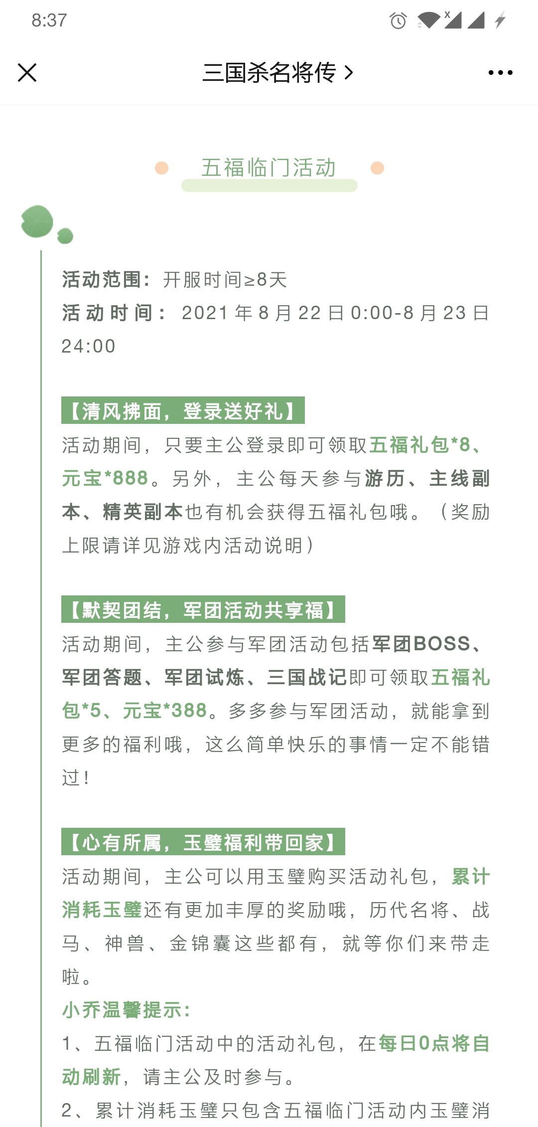 最后,近期的活动是五福临门,土豪玩家的福利,充值就可以拿红书,免费领历代名将,打算投入资金的玩家朋友可以重点关注下这个活动。