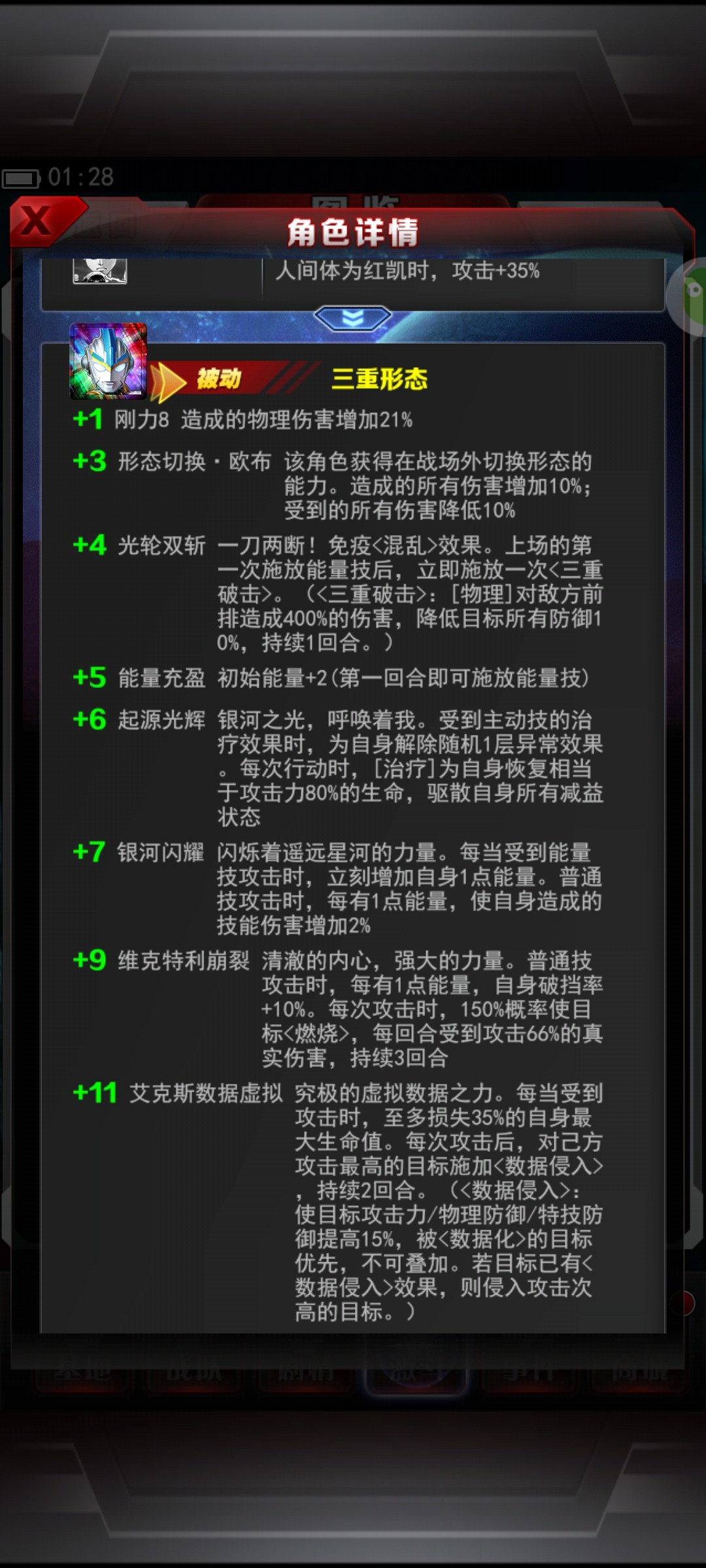 11被动核心被动,继承X锁血被动,大幅度提高生存,后排更佳,每次攻击后对自己阵容攻击最高角色追加数据侵入提高攻击防御,优先针对被数据化角色