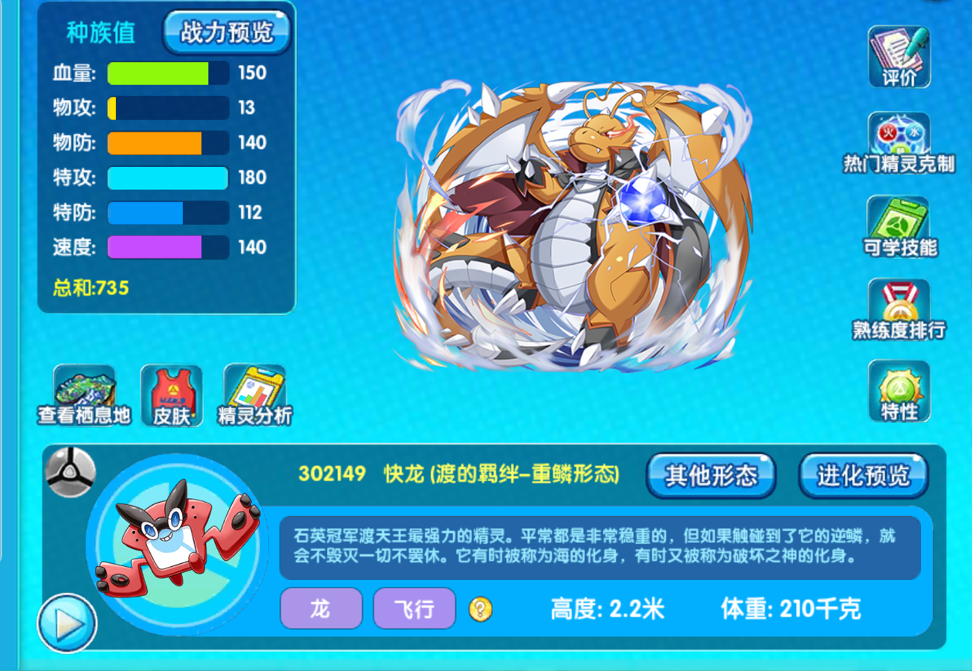 闪光快龙,这一次加强血量又明显提升了,速度方面的话也有提升,特防的话,我个人感觉下降了一点点,物防我没有留意过,但是133再加上新特性和新专属的减伤效果,应该还是比较肉的,更关键它是可以学习天龙流星的,大家可能要注意了,闪光快龙使用天龙流星是不会触发这个副作用的。主要原因就是来源于它的这个特性效果,大家可以去看我之前的那一篇平民介绍,就明白了。