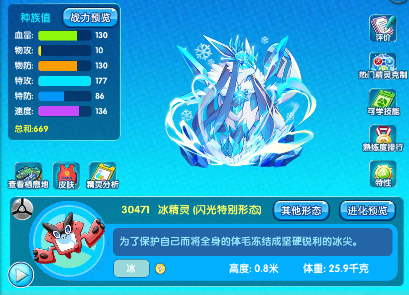等了好久,又一个闪光伊布家族登场了和之前的火精灵一样,这个形态是需要充值的,我个人猜测价格应该会在328,说实话的,他这个种族值搭配我个人感觉有点不合理,但是呢,又有点合理,因为大家应该都知道冰精灵,他不是水精灵呀,他是一个输出但是大家可以看到它有130点的血量种族值这简直比一些肉盾血量还高,根本没啥用如果转移到速度上面,或者是特攻上面,可能还会更好。
