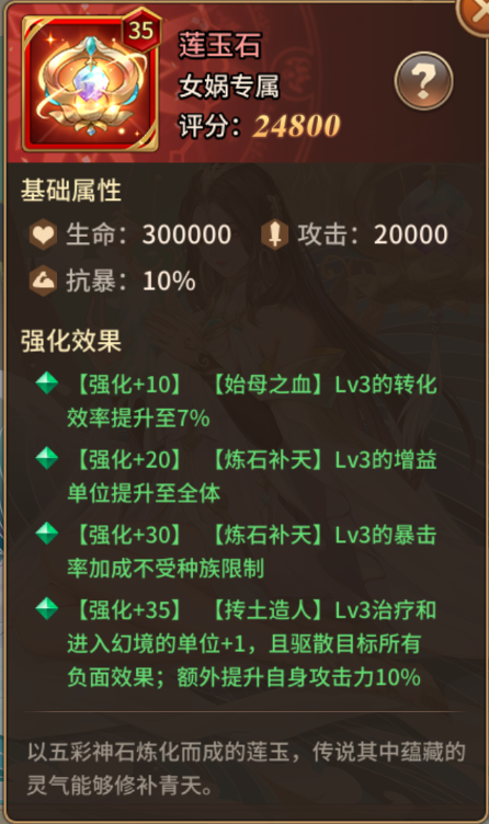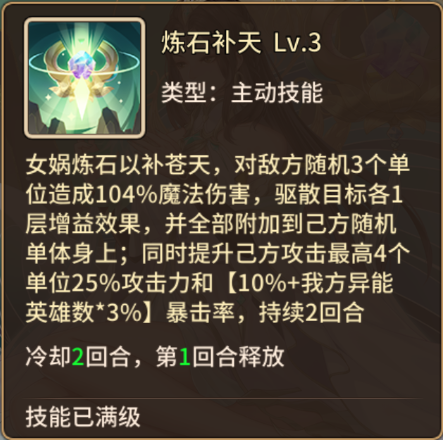 但是过于全面的缺点我相信大家应该也懂,均衡意味着任何一点都不突出,这么说可能不太准确,实际上而言,女娲的核心能力还是攻暴buff效果。其他的附带辅助要么作用并不明显,要么要求太高了。