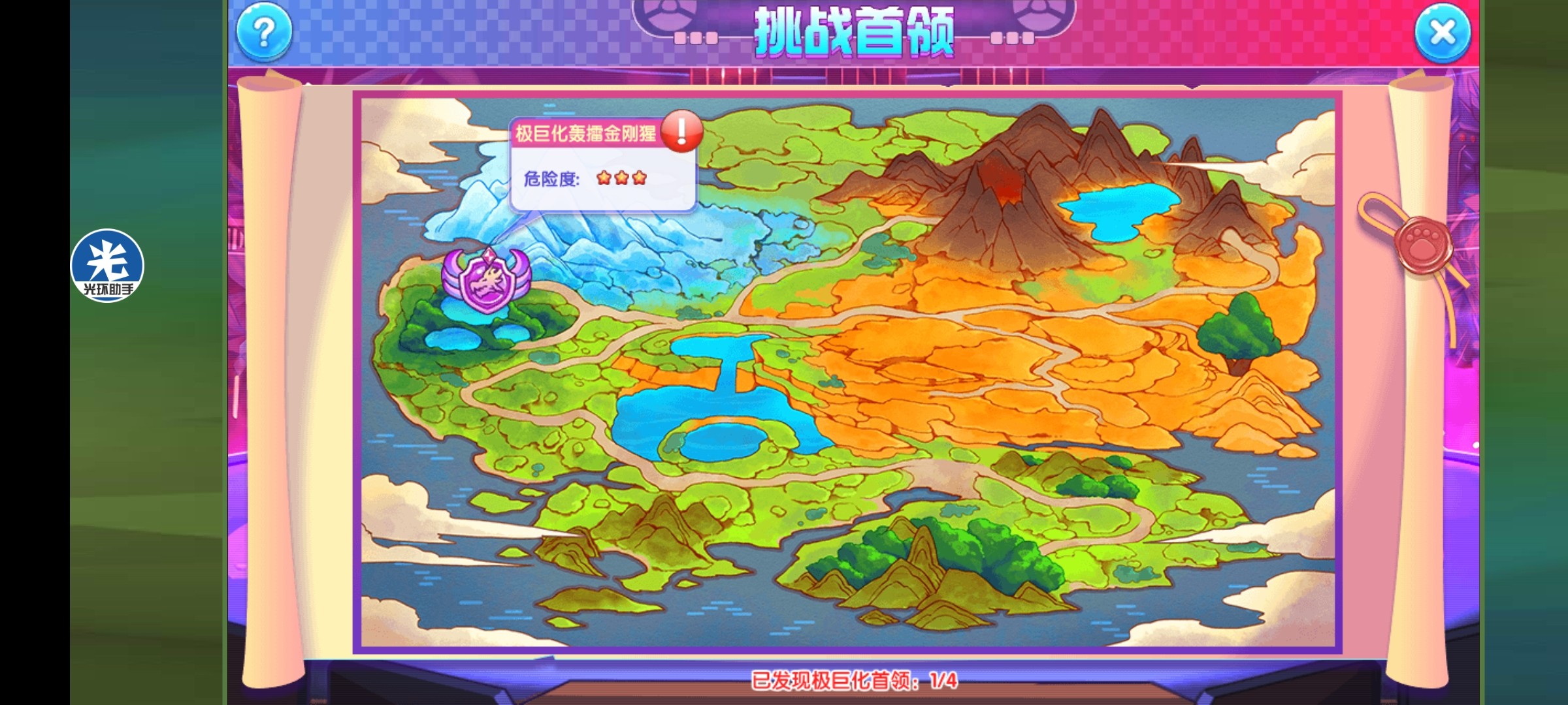 发现后点击巢穴触发任务,然后回到前面界面,点击挑战首领,在地图这里触发感叹号的剧情,就能遭遇极巨化宠物。