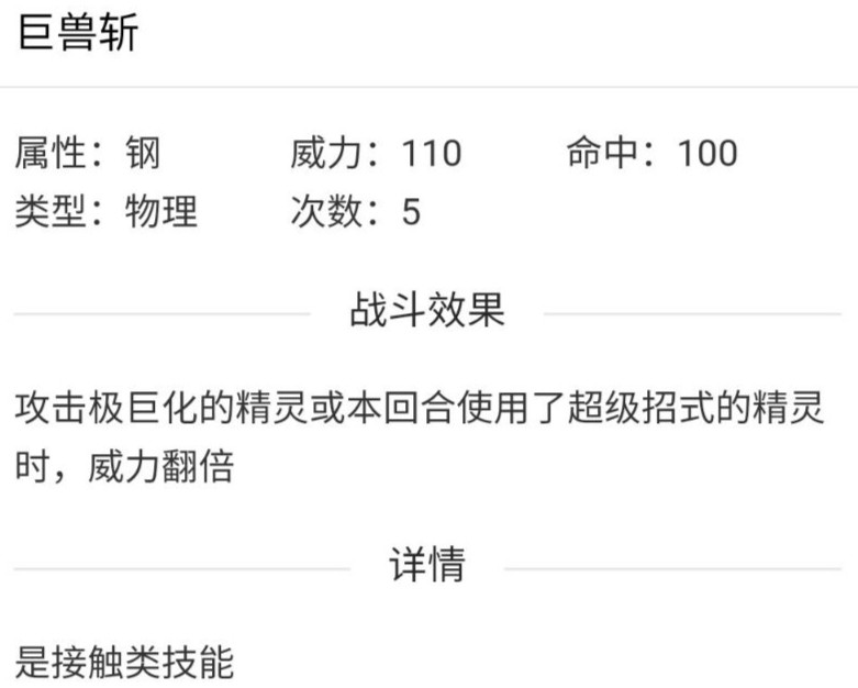 所有属性的普通极巨技能都是叫极巨X X,一个物攻一个特攻,对应精灵携带的物攻和特攻技能,而变化技能演变为极巨守护。
