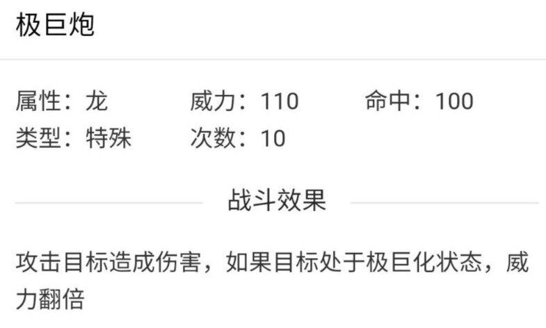 当然特殊说明的技能除外,(如极巨炮会变成无极巨炮),所有攻击技能都会变成和原技能属性和类型- - 致的无特殊效果的攻击技能,技能威力随原技能而变化,且最高不会超过160 (如果极巨化后的技能是多段攻击的技能时,极巨化的技能威力提升效果会平均分到每段攻击中)