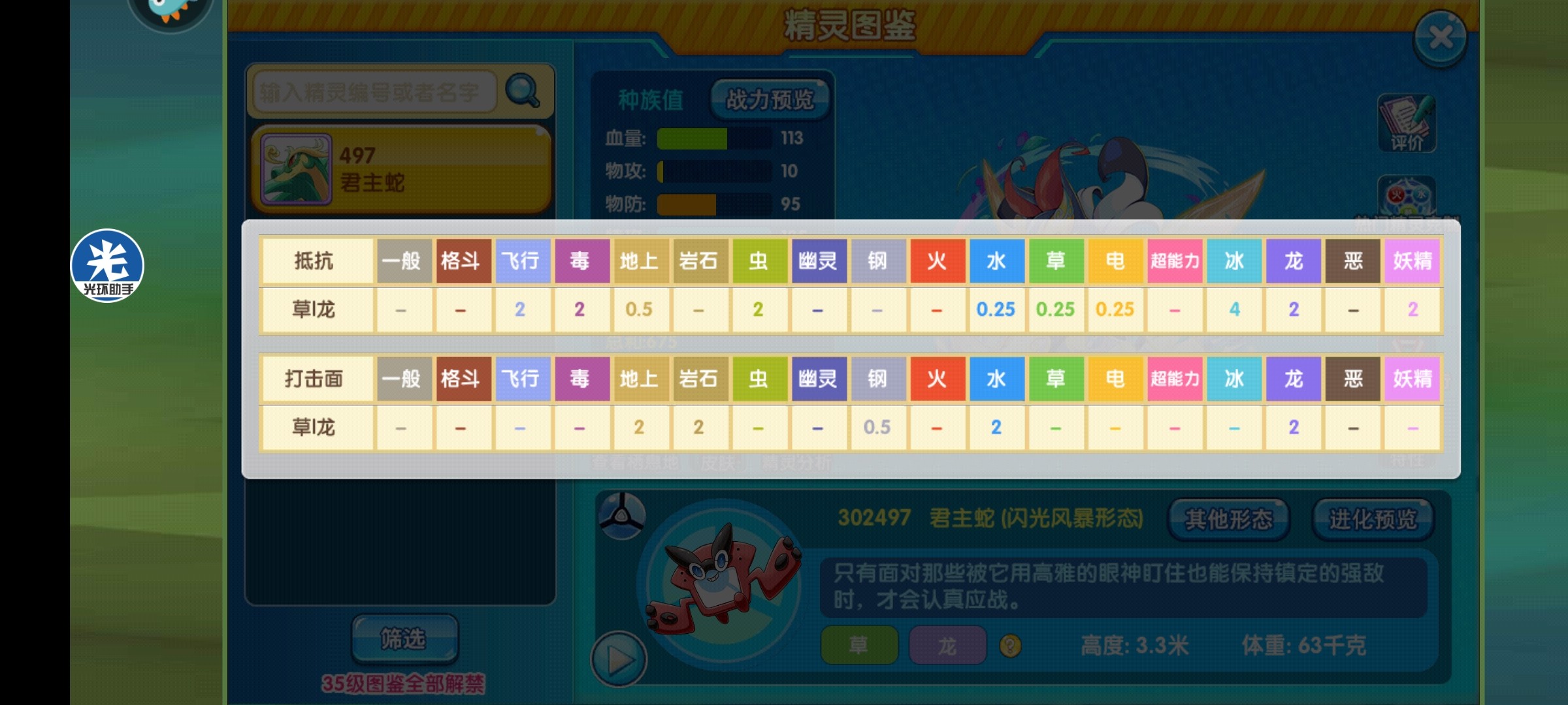 经过这一次的加强君主蛇增加了龙属性,草龙属性打击面挺好的,能打目前主流的龙系,水系等。抗性也不错,抵抗电、水、草、地,但是弱毒、冰、飞行、龙等等热门属性。