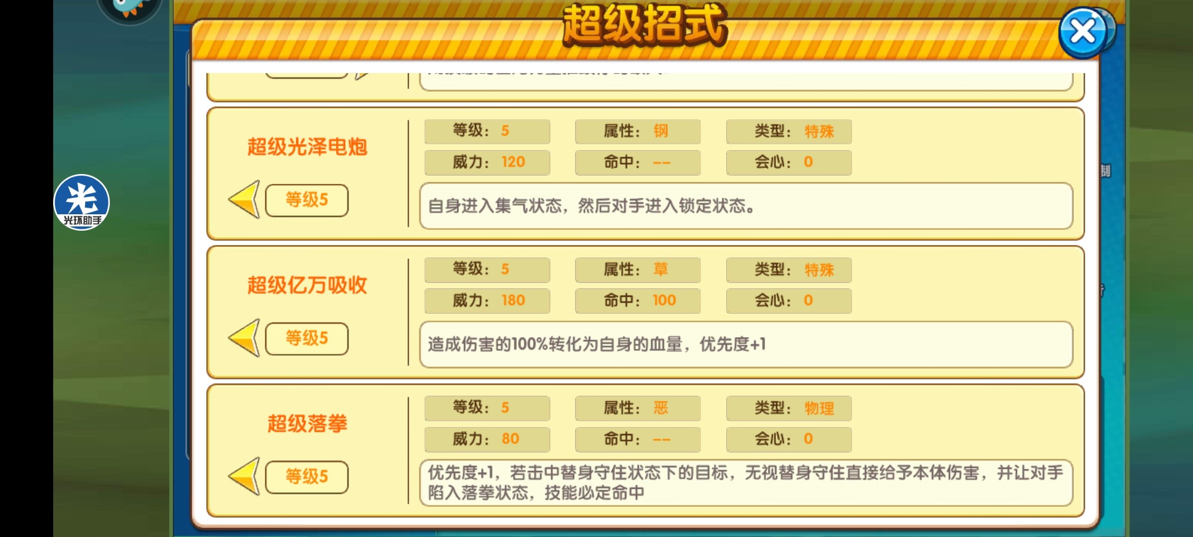 z招这里推荐超级亿万吸收。超级亿万吸收优先度为1能够先手收割对方宠,同时还能够回复血量,简直是一举两得。超级光泽电炮也是个不错的选择,在造成伤害的同时能进入集气状态,攻击的时候有机会暴击。