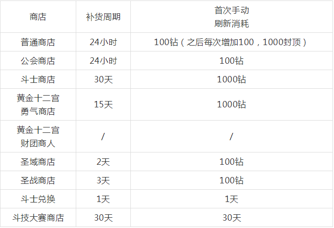 斗士商店:斗士商店的刷新时间非常长,长达一个月,刷新价格高达1000钻。如果有代币的话建议先将内部商品买光,都是有用的。