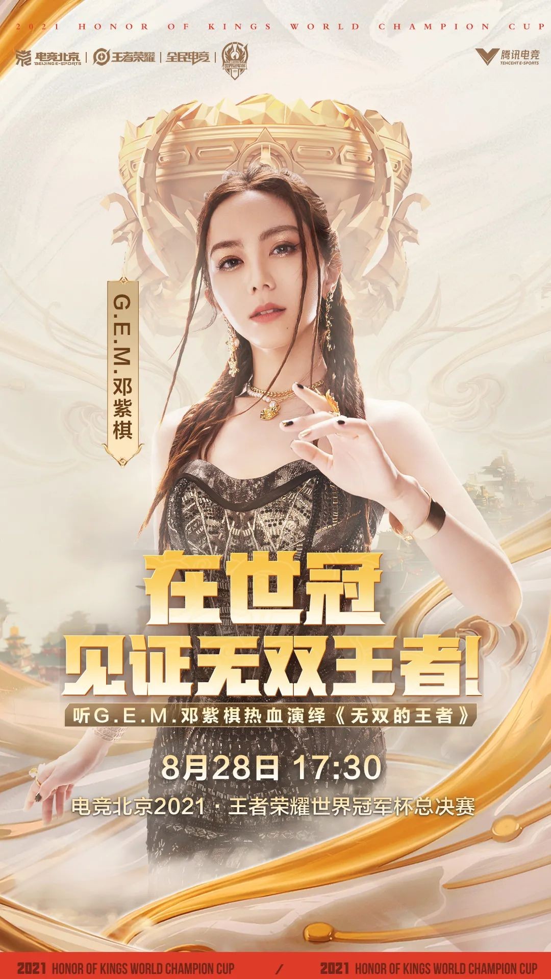 无双歌者邓紫棋将于世冠总决赛中场秀为大家带来2021王者荣耀世界冠军杯主题曲《无双的王者》和《倒数》。让我们随着歌声一起走入世冠的领域,体会王者荣耀顶级赛事的热血与感动,感受世冠“竞无双”的精神内涵!一起燃爆全场,为荣耀的王者喝彩!