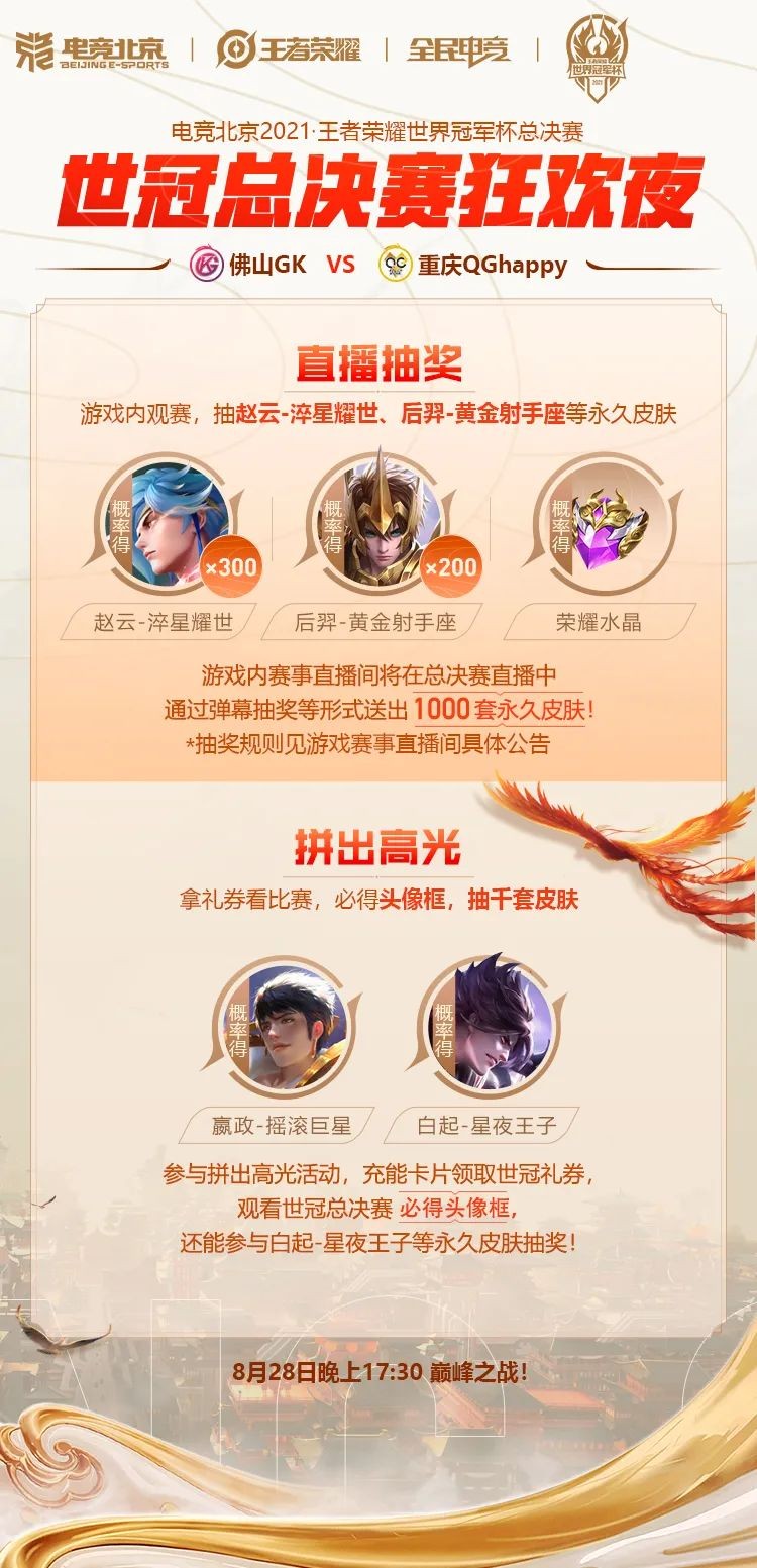 电竞北京2021·王者荣耀世界冠军杯总决赛直播期间,大家在游戏内赛事专区观赛时,参与弹幕抽奖、预测玩法等拿海量皮肤!300个赵云世冠专属皮肤加上后羿-黄金射手座、李白-千年之狐等共计1000套永久皮肤等你来拿!更有荣耀水晶、700个永久英雄、实物奖品送不停。