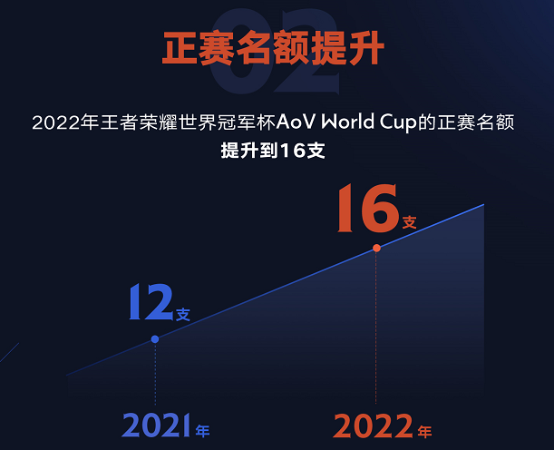 2022年的王者荣耀世界冠军杯Arena of Valor World Cup,将会呈现更加精彩广阔的世冠舞台,赛事的正赛名额,也将从12支提升至16支,涵盖亚洲、北美、南美、欧洲、中东等地区的本土战队和选手。