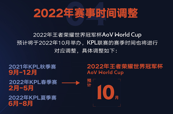 作为王者荣耀世界冠军杯的重要赛区之一,KPL赛区也发布了最新赛程规划:2021年KPL秋季赛将于今年9月份照常启动,2022年的KPL联赛将会调整为春季赛和夏季赛,分别在2-5月和6-8月举办。