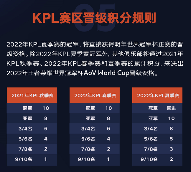 同时,为了能够选拔出KPL赛区真正具备“世界级”实力的代表队伍,KPL赛区对2022年王者荣耀世界冠军杯的晋级积分规则也进行了进一步的优化:2022年KPL夏季赛的冠军队伍,将直接获得2022年王者荣耀世界冠军杯正赛的参赛资格,其余战队则将通过2021年KPL秋季赛、2022年KPL春季赛和夏季赛的累计积分,来决出晋级资格。