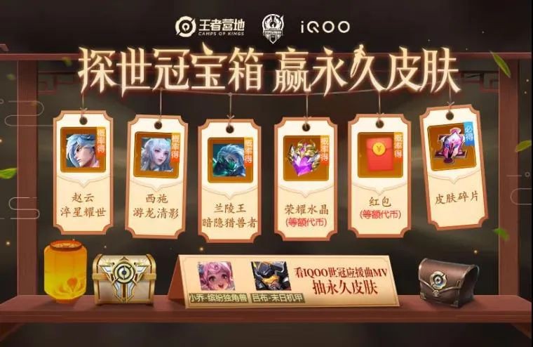 【看世冠总决赛,赢永久皮肤】活动全面开启,来王者营地探寻宝箱即可获得皮肤碎片、亲密玫瑰等好礼哦~开启荣耀王者宝箱,还有机会获得赵云-淬星耀世,西施-游龙清影等永久皮肤哦~