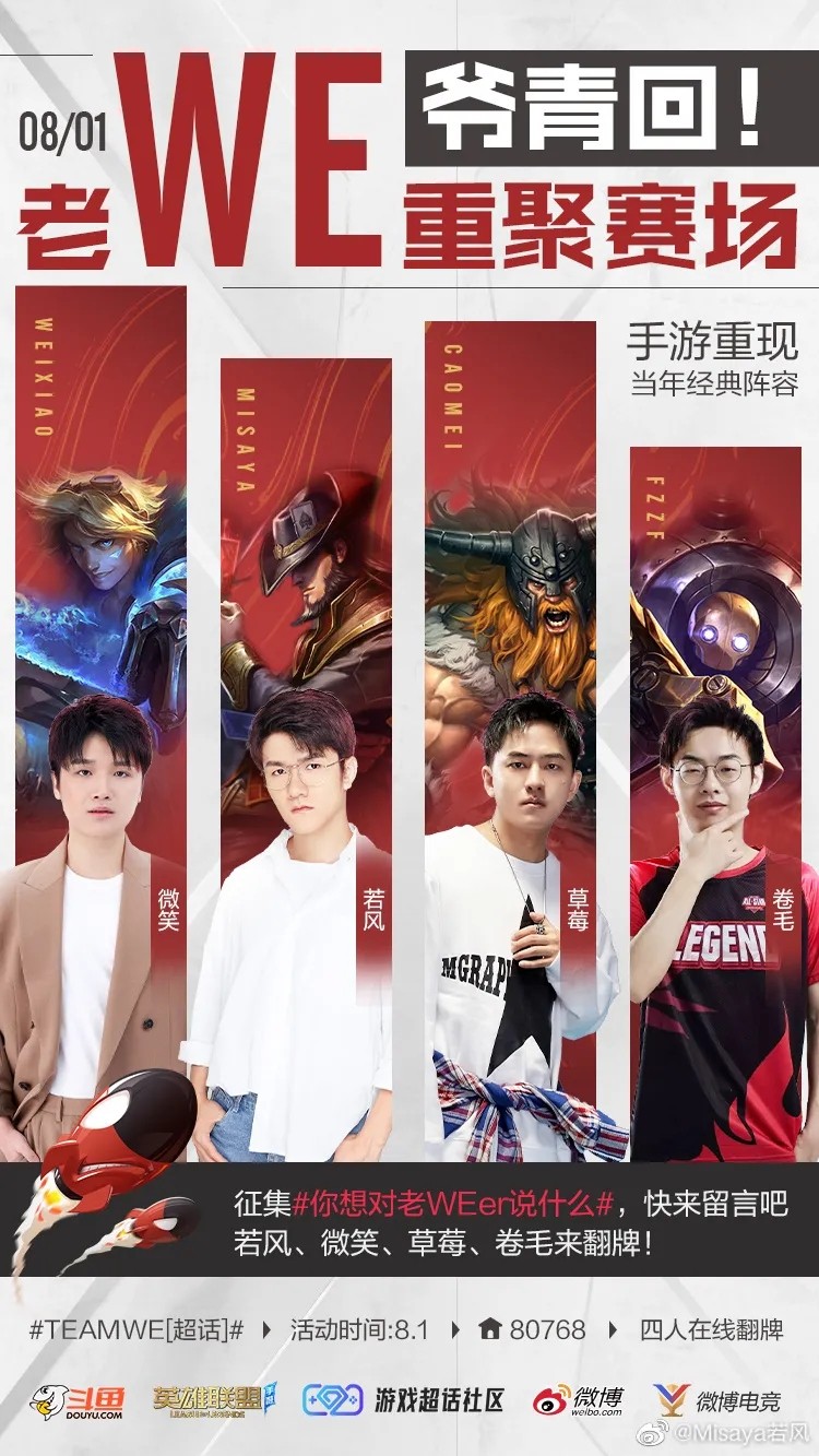 然后就是老WE的几位前职业选手,偶尔看他们四个连麦OB比赛很有趣,不知道这次官方会请几位当嘉宾,反正若风的概率是很高的,他是除灵药外在手游中最为活跃的主播了,之前的中韩对抗赛发挥还挺好。