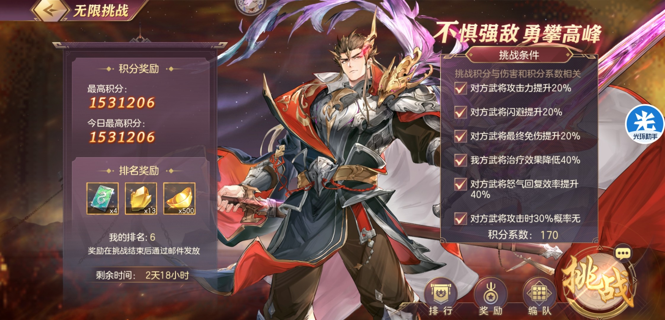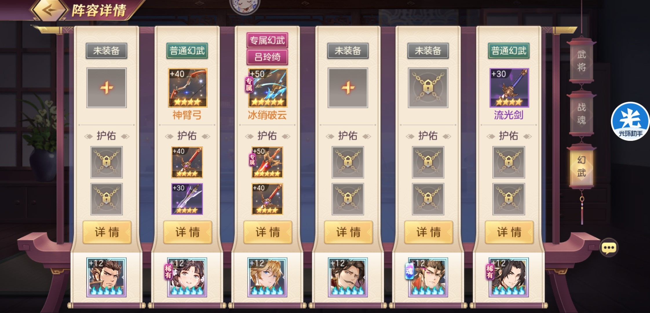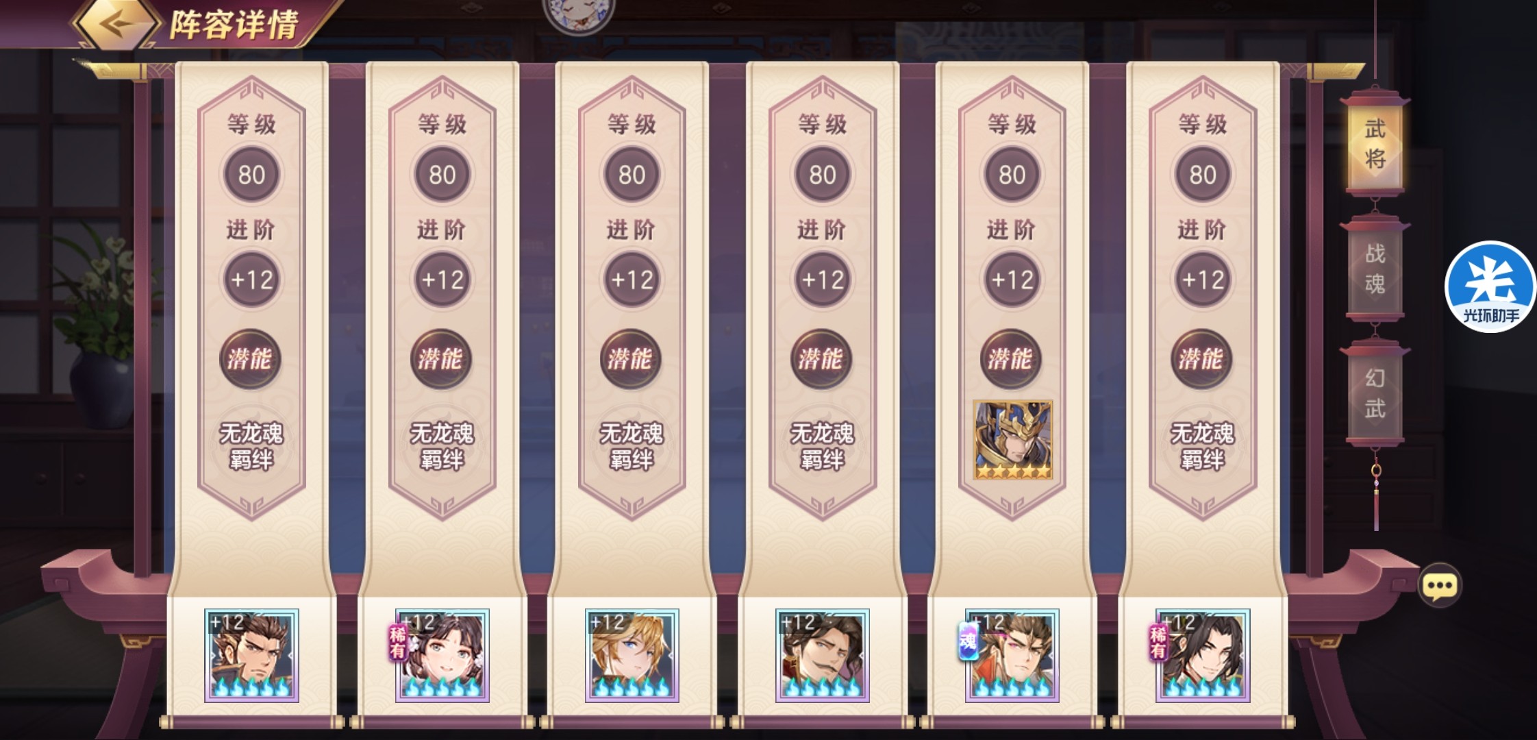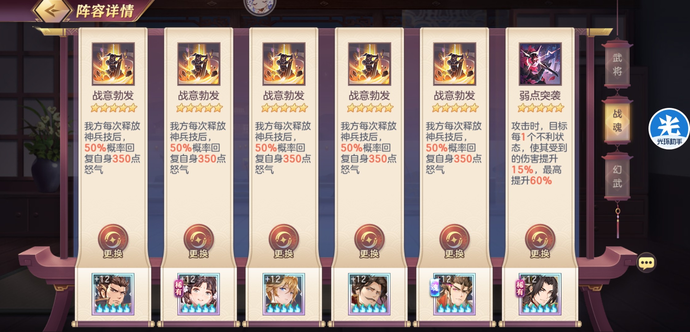 【无限挑战】第三期阵容推荐,穷奇助战可以稳定出分率赵学-啊B✨发布于 2021-08-30关注注意事项1.第三期不比前两期 包括荀彧刘备在内都是很好的刷分点(尤其是刘备 只要能开出怒攻每个单位普攻都能够回复血量 以满足刷分需求)所以前两期的神兵思路没办法沿用 要尽可能以不会干涉敌方怒气续航的神兵为主 例如葫芦弓斧头2.战魂方面避免怒焰灭袭 战意勃发可提升一定的出分率 3.灵宠方面穷奇助战是首选 没有的就用福牛大象代替4.阵容为初版 后续有更好的阵容会及时更新5.吕玲绮需要专武养成图如下