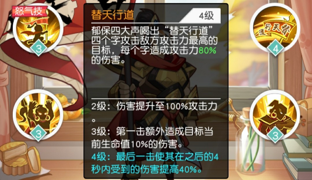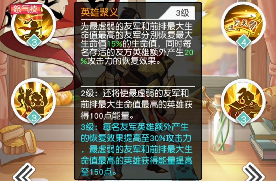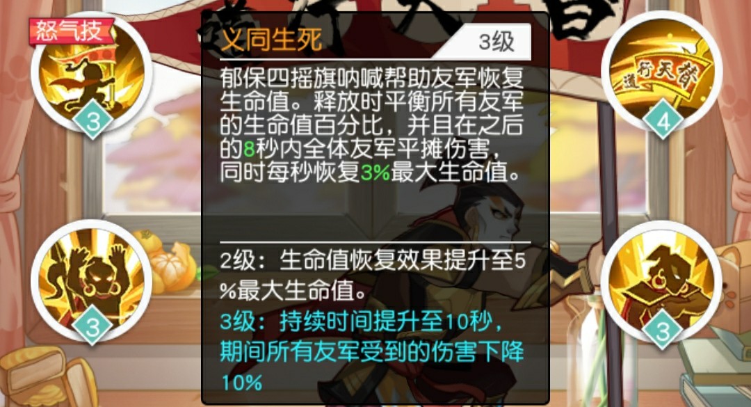 郁保四特点比较全面,能恢复、能减伤、能加暴击率、能获得提速获取能量和提升吸血等。在对局中可瞬间恢复全体大部分血量,改变战局。(声明一下:郁保四的群体治疗其实不是直接加血的而是平衡所有友军的生命百分比的,对智力和敏捷型英雄都是非常好的,有一个单加技能是为虚弱的友军和前排生命值最高的友军恢复血量的)虽然在之前的补丁砍了一刀暴击率,但是整体还是非常优秀的,在梅花阵中非常值得培养的英雄,笔者偏爱!