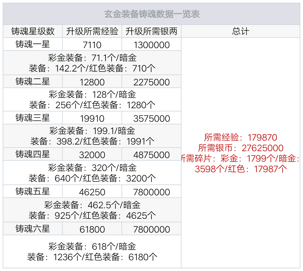 ②具体碎片经验:彩金装备:每个可提供100点经验/暗金装备:每个可提升50点经验/红色装备:每个可提供10点经验值;鎏金装备铸魂满五星需要118070经验+19825000(=11807个红装碎片或2361暗金装备碎片或者1181彩金装备碎片);玄金装备铸魂满六星需要179870经验+27625000银两(17987个红装碎片或3598暗金装备碎片或者1799彩金装备碎片)