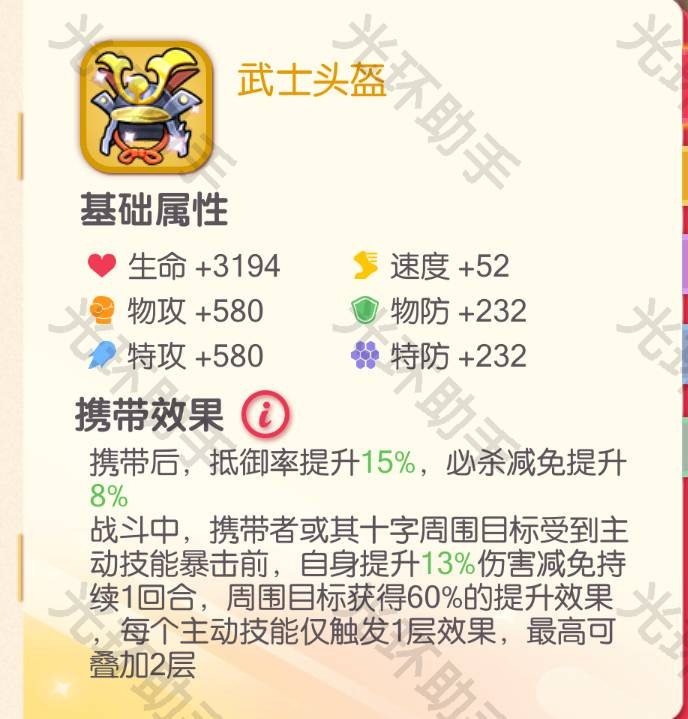 抵御率提升15%,必杀伤害减免提升8%。战斗中为自身提升13%伤害减免,为周围目标提升该效果的60%,且可叠加两层