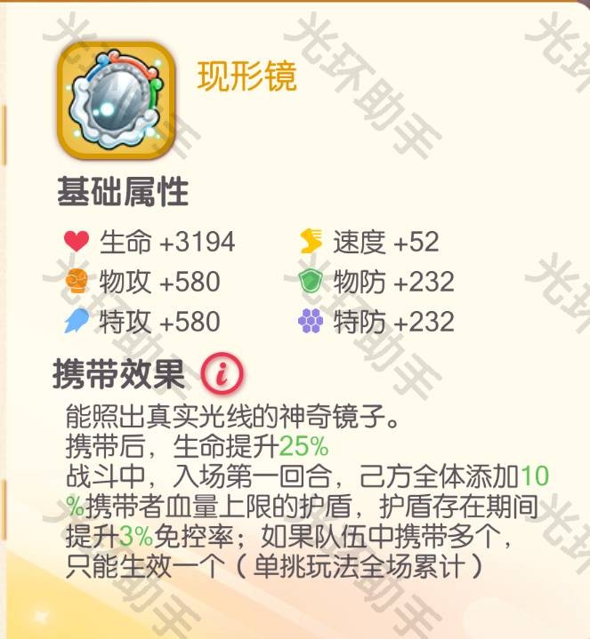综合评价如果携带者的生命值不高,那么现行镜提供的护盾值不会很高,作用不会很大。 属于中规中矩比较一般的携带。