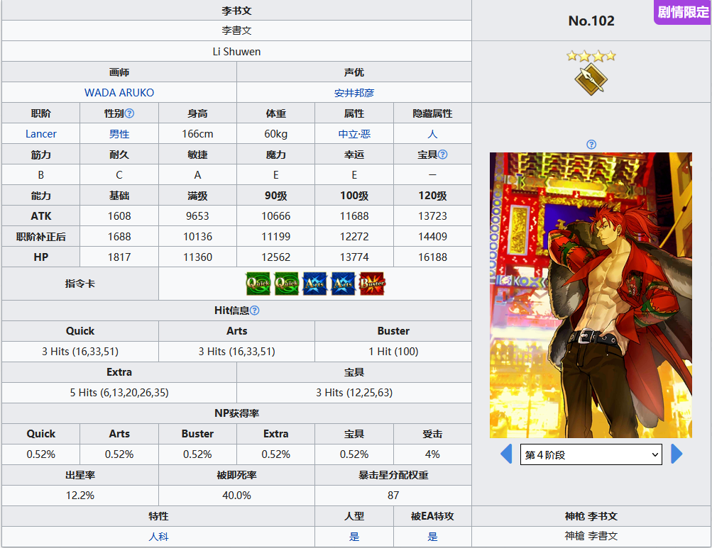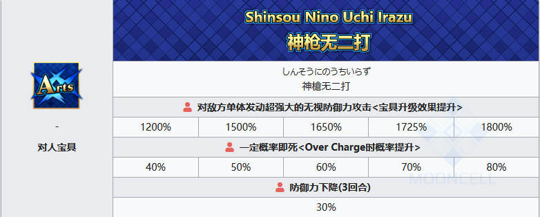 以修炼到极致的武技升华而来的宝具,李书文的成名要素之一。此宝具效果为强化后的版本,蓝卡单体,拥有稀有的无视防御力属性,兼带敌方防御力下降,二宝的伤害就可以属于顶尖的水平了,但hits数低,回收连发很勉强,即死概率低,基本没用。