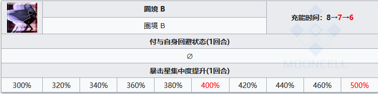 输出型的技能,为单体回合爆发做到极致,暴击威力提升的幅度属于最高档次,配合二三技能能打出超高的暴击伤害,而必中属性也是为了不时之需而准备的。