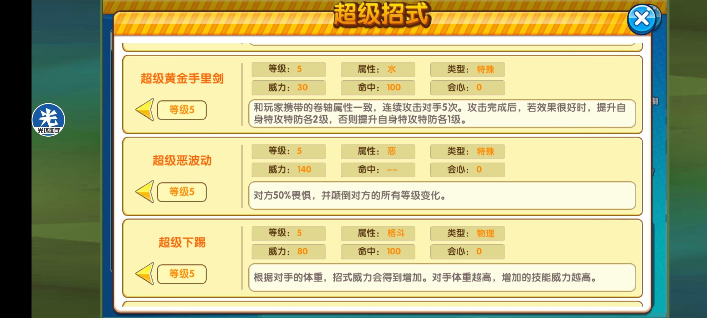 1、超级黄金手里剑连续攻击五次,每次威力30,属性根据水手里剑属性。攻击后,若造成伤害很好,则自身特攻跟速度+2,若不好则+1。作为忍蛙的专属大招,此技能拥有十分不错的效果,亮点一:自己选择属性,可用于补盲;亮点二:使用后最差也有特攻与速度+1的效果,使得接下来输出更上一层楼。