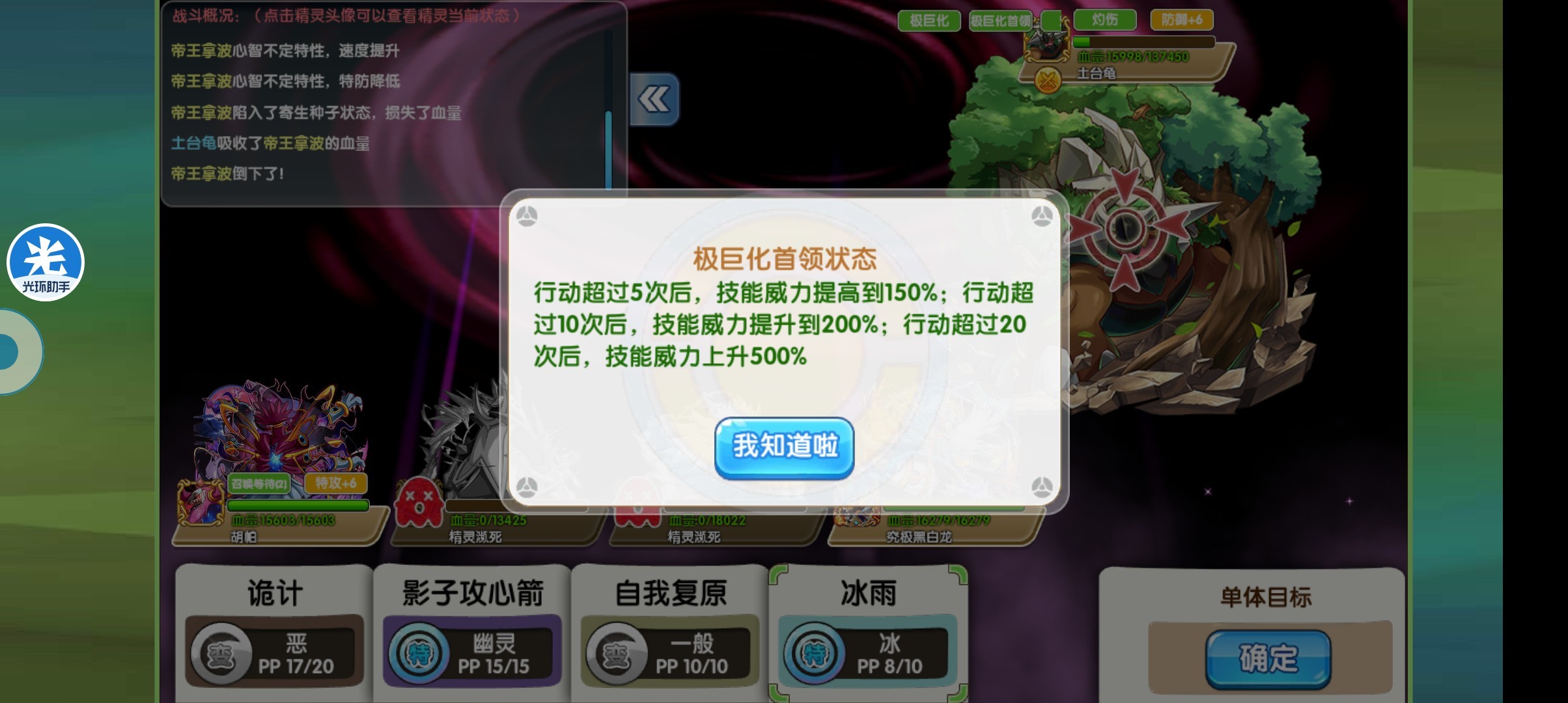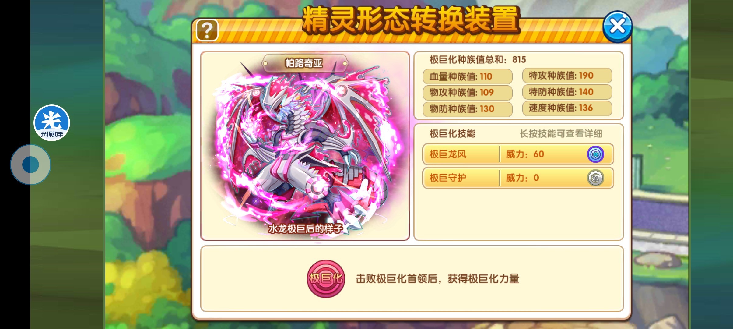 那么需要做的就是要用水龙去挑战这个boss,从而激活极巨化,用别的精灵是代替不了的,所以说激活和刷材料是两码事,激活只能用你需要激活的精灵去打,如果是刷材料的话,任何精灵都是可以的