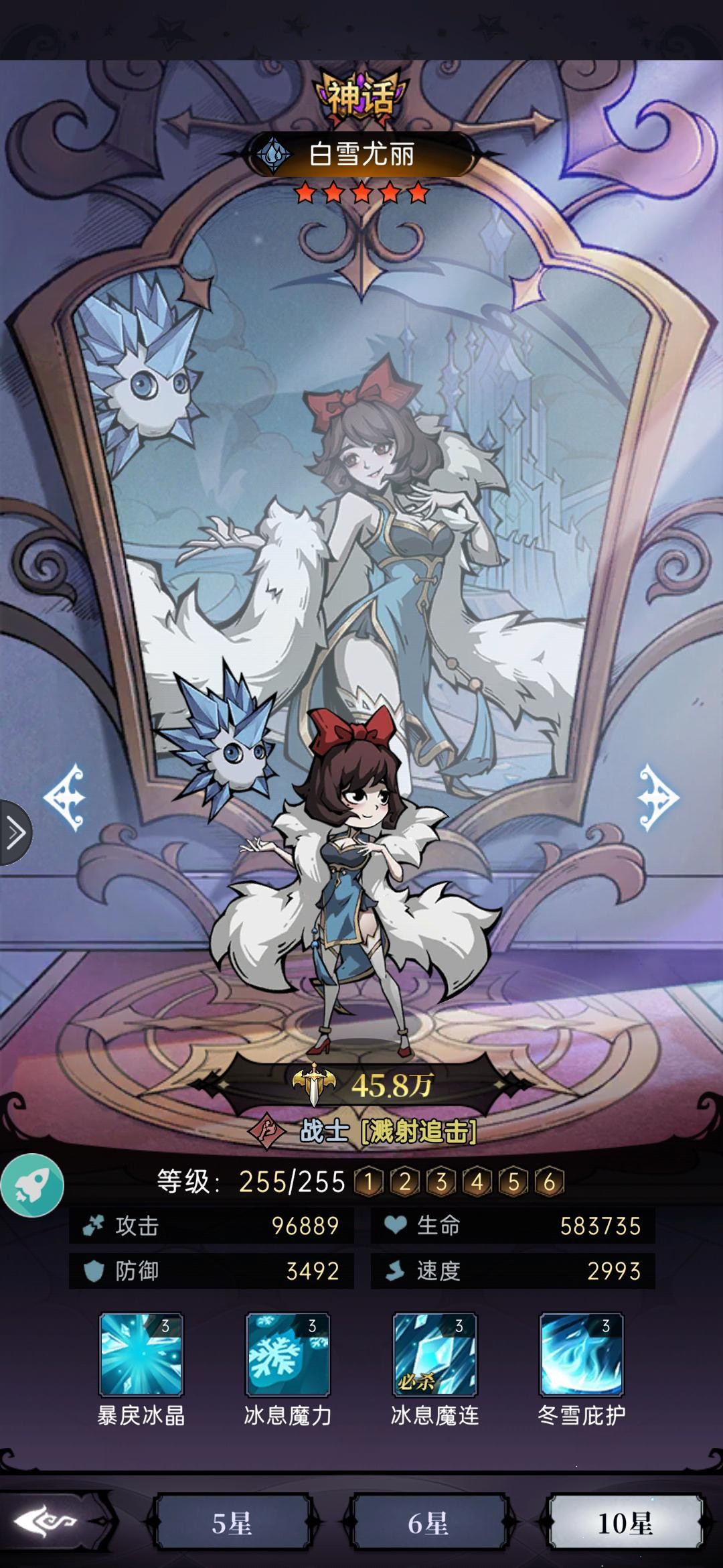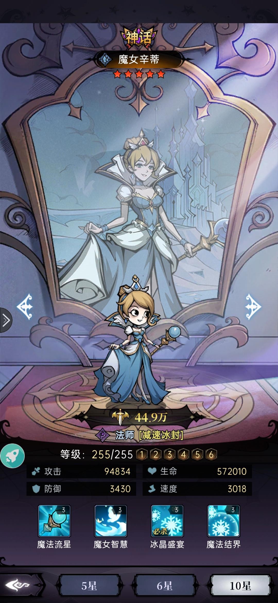 伙伴分析:辛蒂输出并不高,但是拥有强大的控制,使得辛蒂可以在很多阵容上搭配,开局减速降低敌方抵抗增加控制几率使得自己冰封技能效果加强,喜欢控制的话可以优先考虑养这个,获取难度比白雪难一些。