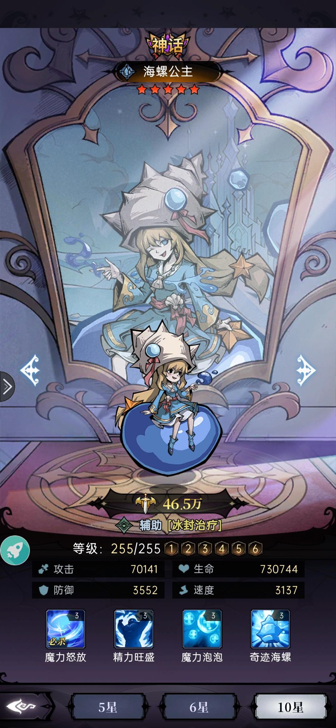 魔力泡泡:恢复全体生命,益出的生命值转化为护盾,全体每回合恢复海螺25%攻击的生命,攻击提高25%(主动2技能,冷却4回合)