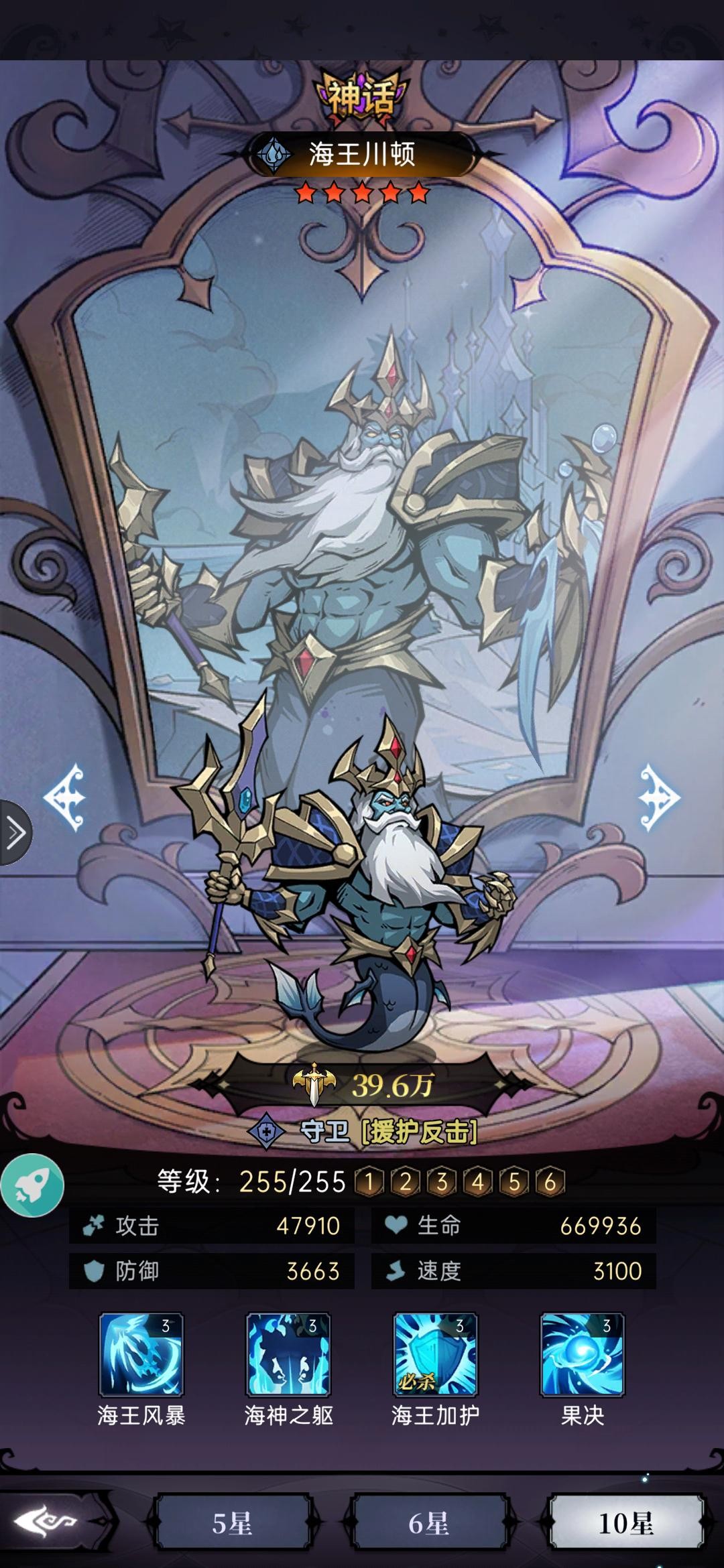 海神加护:提高自身生命,攻击,速度(被动1技能,无冷却)